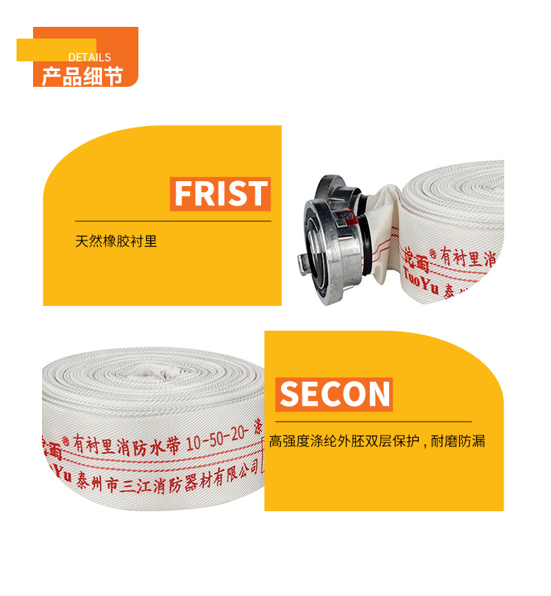 1MPa涤纶长丝+橡胶20m50mm内扣式根否5根/袋10-50-20TUOYU/沱雨橡胶有衬里消防水带(含接口)5根/袋工作压力1MPa 口径50mm 长度20m 配内扣式接口