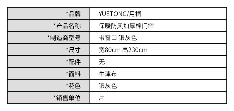 带窗口 银灰色宽80cm 高230cm无牛津布银灰色片YUETONG/月桐保暖防风加厚棉门帘-80×230cm 窗口40×60cm