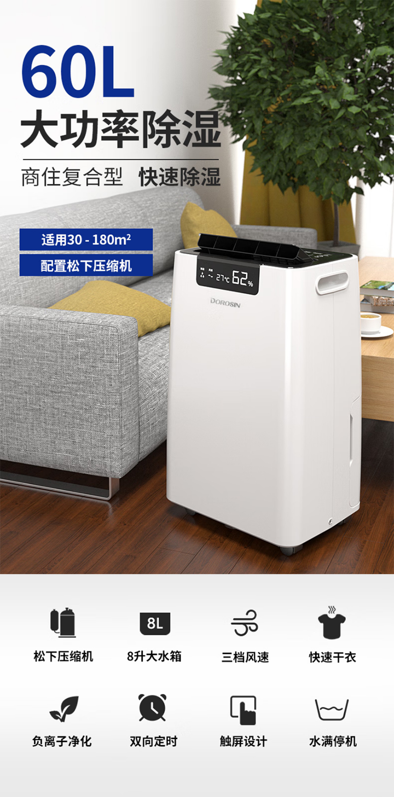 - 核心规格:60L/d 220V 30~180m² 不含安装服务