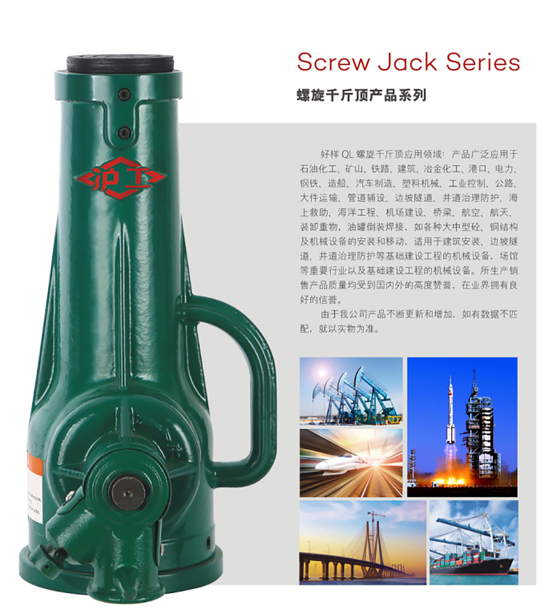 ·本产品适用于铁道车辆检修、矿山、建筑工程支:撑和一般重物起升下降之用。由于携带轻便,维护简易、使用安全可靠,因此广泛适用于流动性的起重作业。如铁道车辆更换轴衬、钢梁结构安装支撑,船体龙骨重型机械装配,汽车拆换轮件升降都可用本产品安全可靠地达到起重目的。
