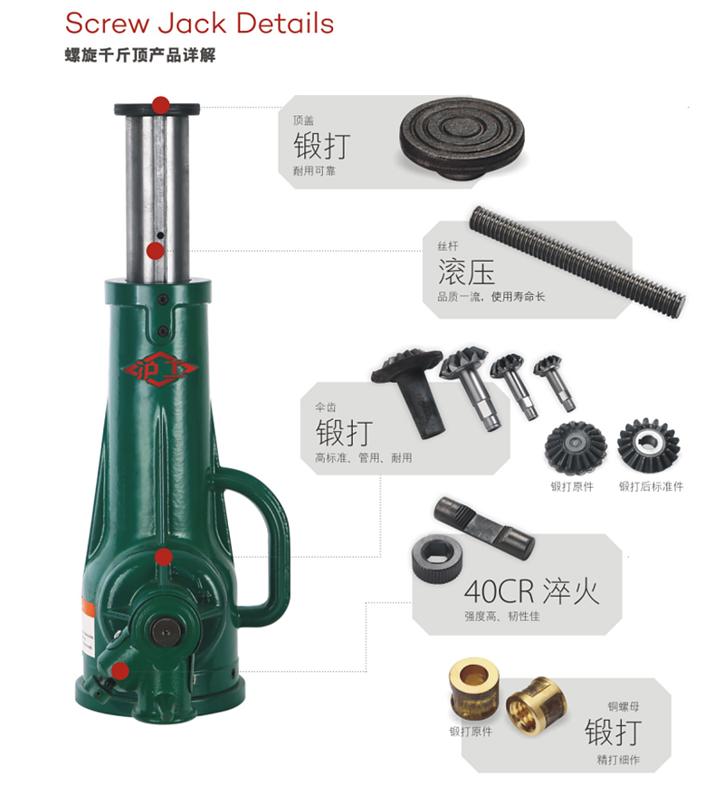 ·40CR淬火强度高、韧性佳 ·高标准伞齿和顶盖锻打件生产技术 ·喷塑外观品质优异 ·滚压丝杆品质一流,使用寿命长 ·精打细作锻打铜螺母