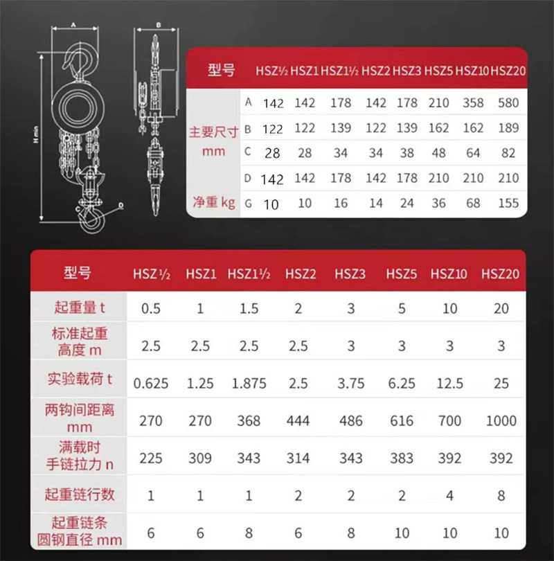 - 核心规格:额定载荷0.5t 起升高度6m 链条数1