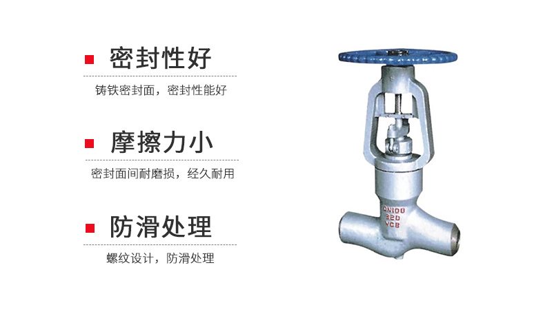 ·工作原理:依靠手轮驱动阀杆向下施加压力,阀瓣密封面与阀座密封面紧密贴合,阻止介质流通。 ·功能:实现管路系统的开通和截断·产品设计结构合理,密封可靠,性能优良,造型美观 ·体积小,结构简单,制造和维修比较方便 ·工作行程小,起闭时间短 ·密封性好,密封面间摩擦力小