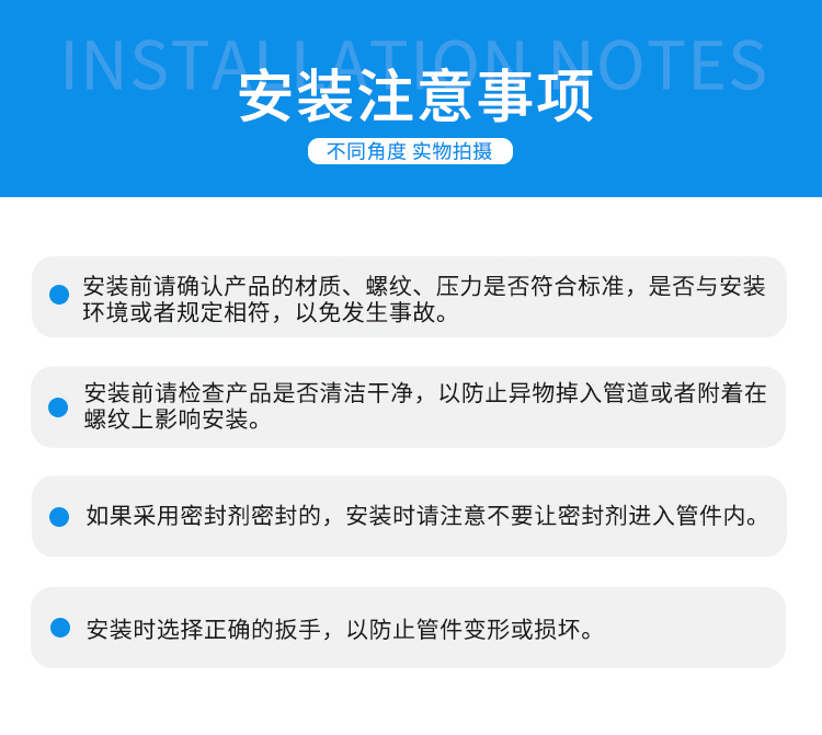 ·不锈钢材质,精选优质304/316不锈钢制造,不易生锈,耐腐耐蚀 ·整体加厚,抗压性能更好,可靠度高,使用更加持久,安全无忧 ·标注清晰,精密铸造,表面字体清晰,查看方便 ·螺纹光滑,螺纹光滑无毛刺,安装更加快速,省时省力