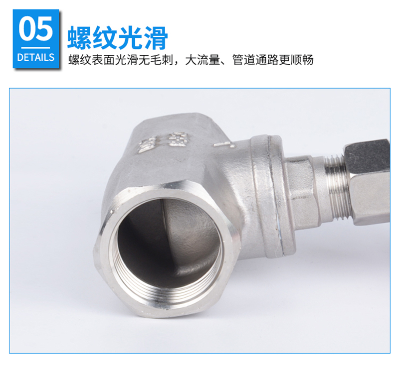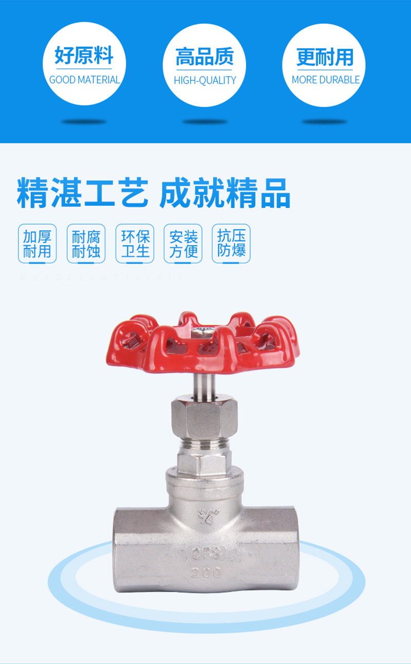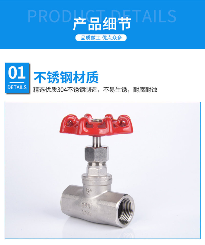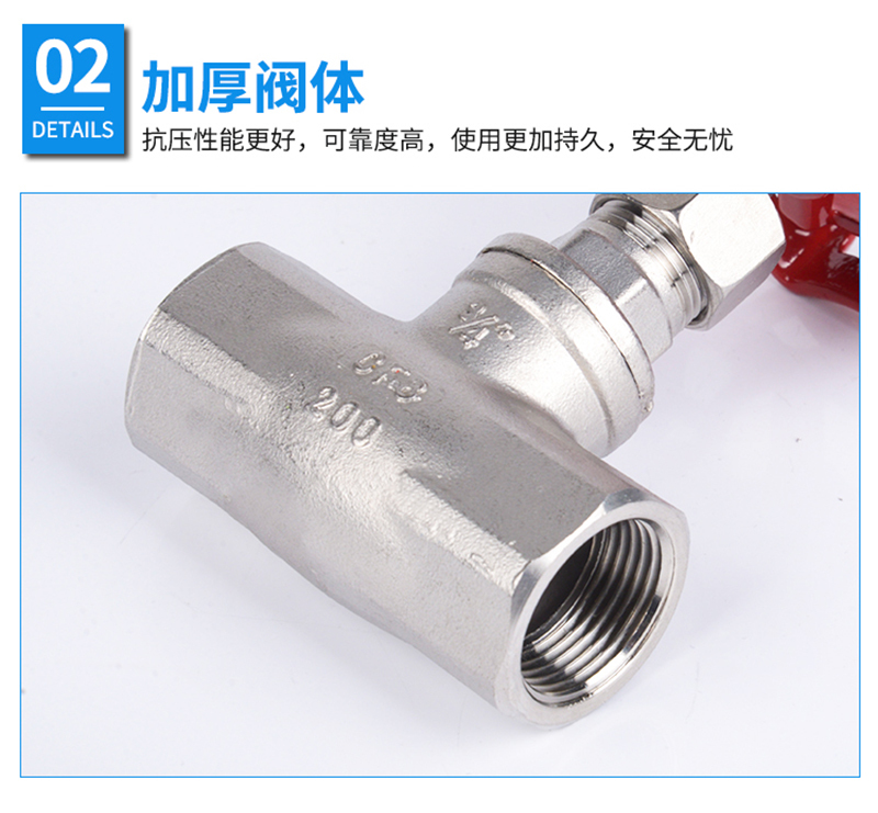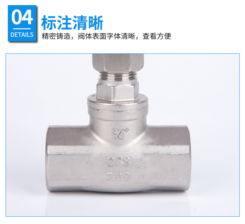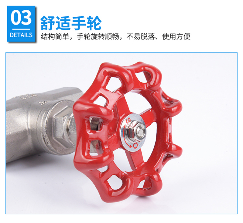 ·不锈钢材质,精选优质304/316不锈钢制造,不易生锈,耐腐耐蚀 ·加厚阀体,抗压性能更好,可靠度高,使用更加持久,安全无忧 ·舒适手轮,结构简单,手轮旋转顺畅,不易脱落、使用方便 ·标注清晰,精密铸造,阀体表面字体清晰,查看方便 ·螺纹光滑,螺纹表面光滑无刺,大流量、管道通路更加顺畅