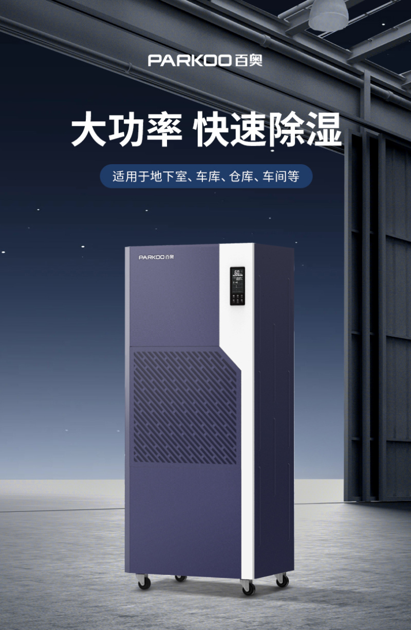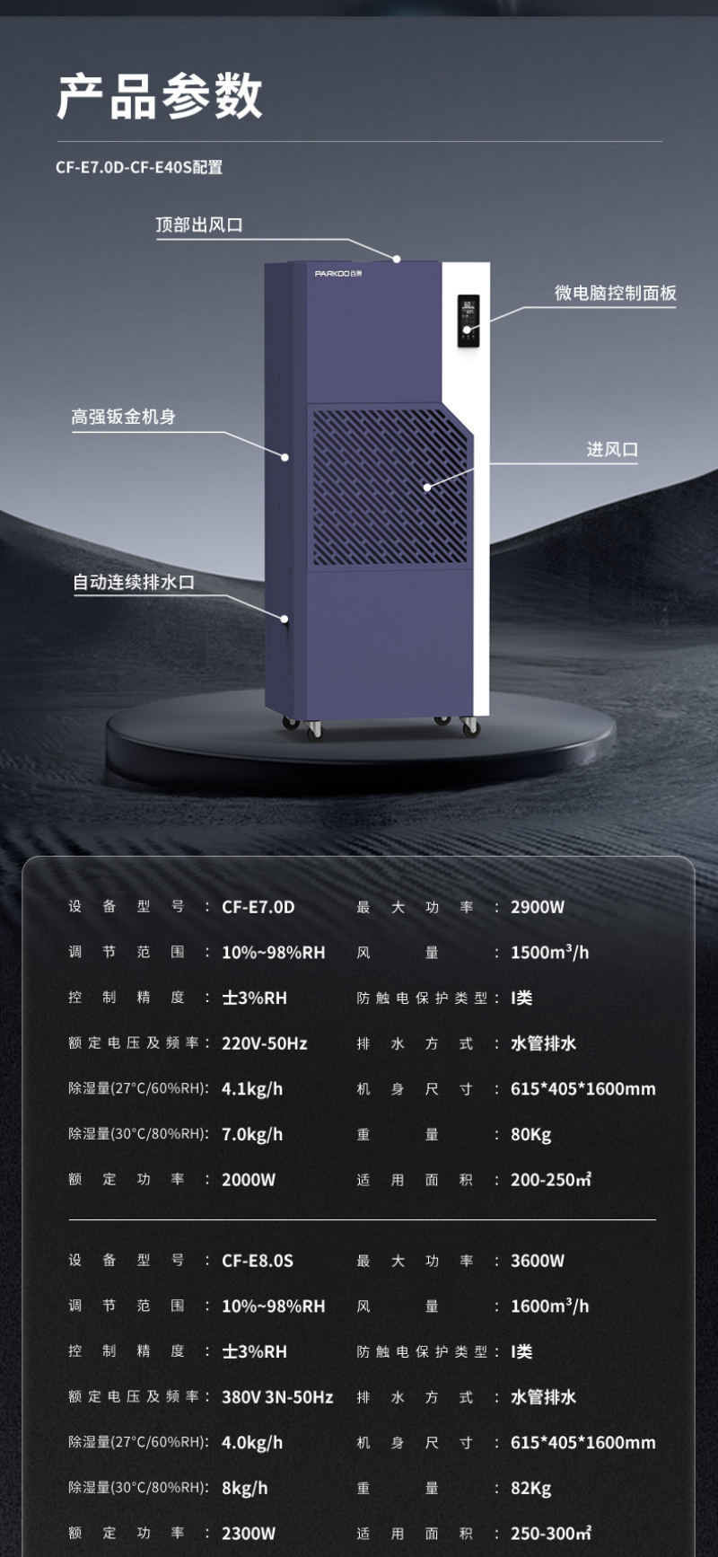 CF-E12S3803450168台350~4000725×500×1730mmPARKOO/百奥金钻E系列工业除湿机-380V 3450W 除湿量7kg/h 适用面积350~400㎡ 485通讯接口