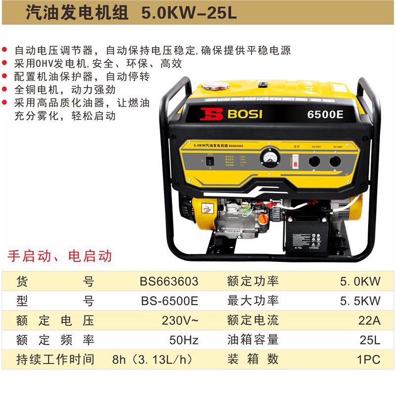 BS663603电启动无5kW台3.13L/h25LBOSI/波斯汽油发电机-25L