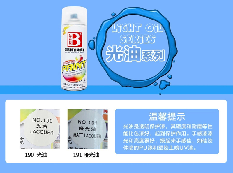 ·用前彻底去除需喷漆部位的油污、水渍和尘埃。喷漆前必须上下左右摇动管子约两分钟,至漆液充分混合均匀。先在试板上小面积喷涂,确定所选颜色的准确性。距被喷物体表面约15-30厘米处,用食指压下喷头来回均速喷涂。采用多次喷法,每隔5分钟喷上薄薄一层,比一次完成效果更佳。剩下少量油漆无法喷出时,请将喷嘴旋转180°再喷。如一次未喷完,存放前将漆罐倒置,压下喷头约3秒钟,清理喷嘴余漆,以防堵嘴。