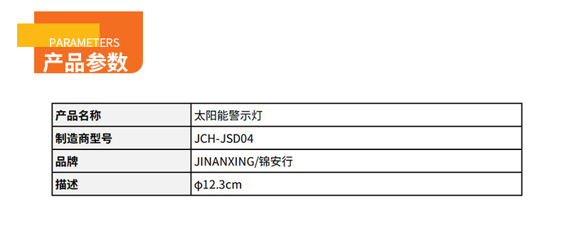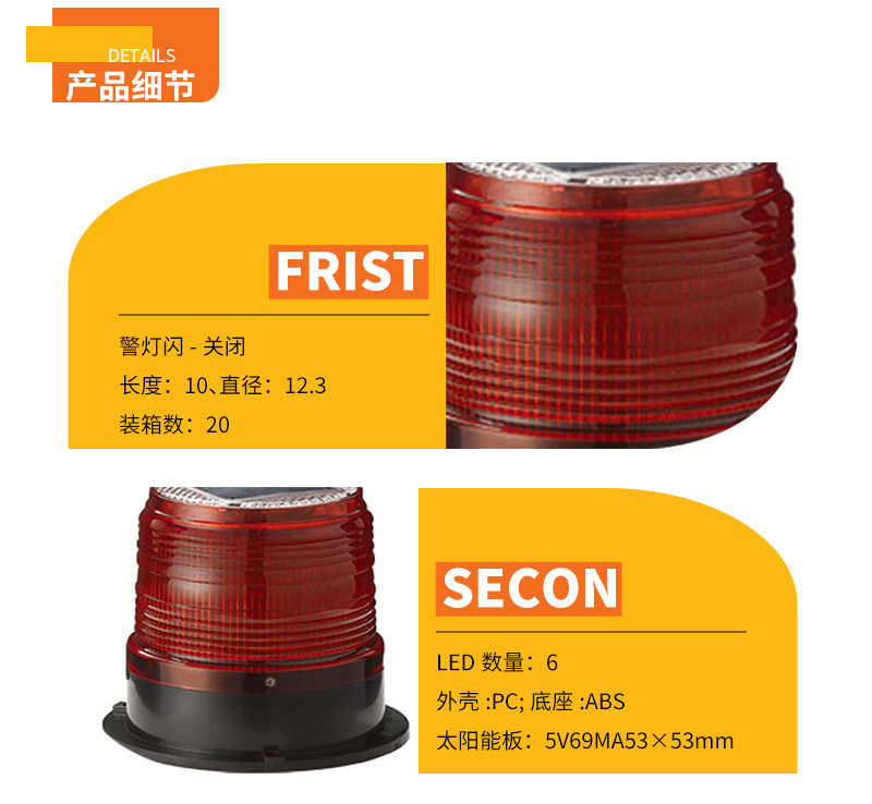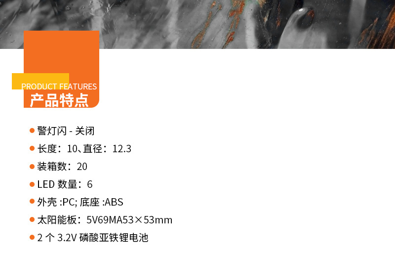 ·警灯闪-关闭 ·长度:10、直径:12.3 ·装箱数:20 ·LED数量:6 ·外壳:PC;底座:ABS ·太阳能板:5V69MA53*53MM ·2个3.2V磷酸亚铁锂电池