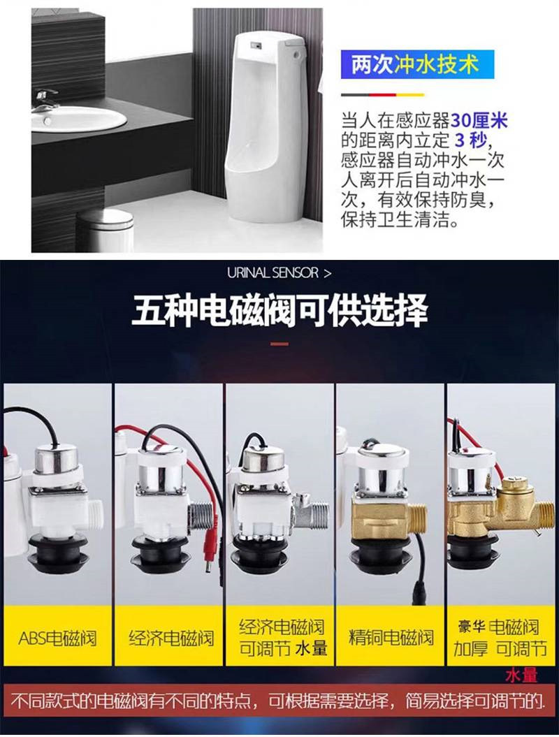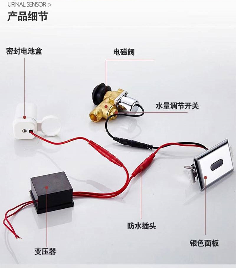 ·一体小便器冲洗感应器有ABS电磁阀,经济款不可调节,不锈钢电磁阀可调节,铜电磁阀,铜电磁阀可调节等多种规格有电磁阀面板高压管控制器和垫圈面板是8*5cm