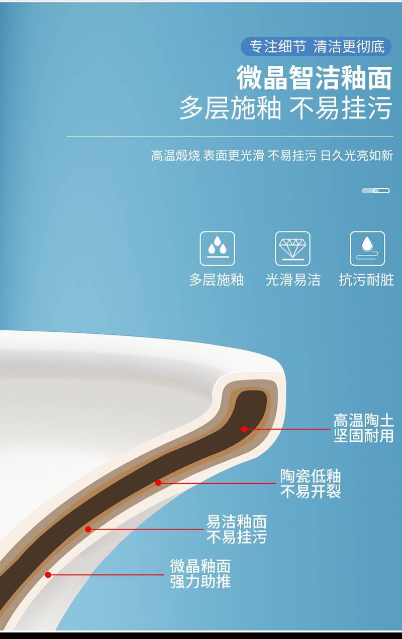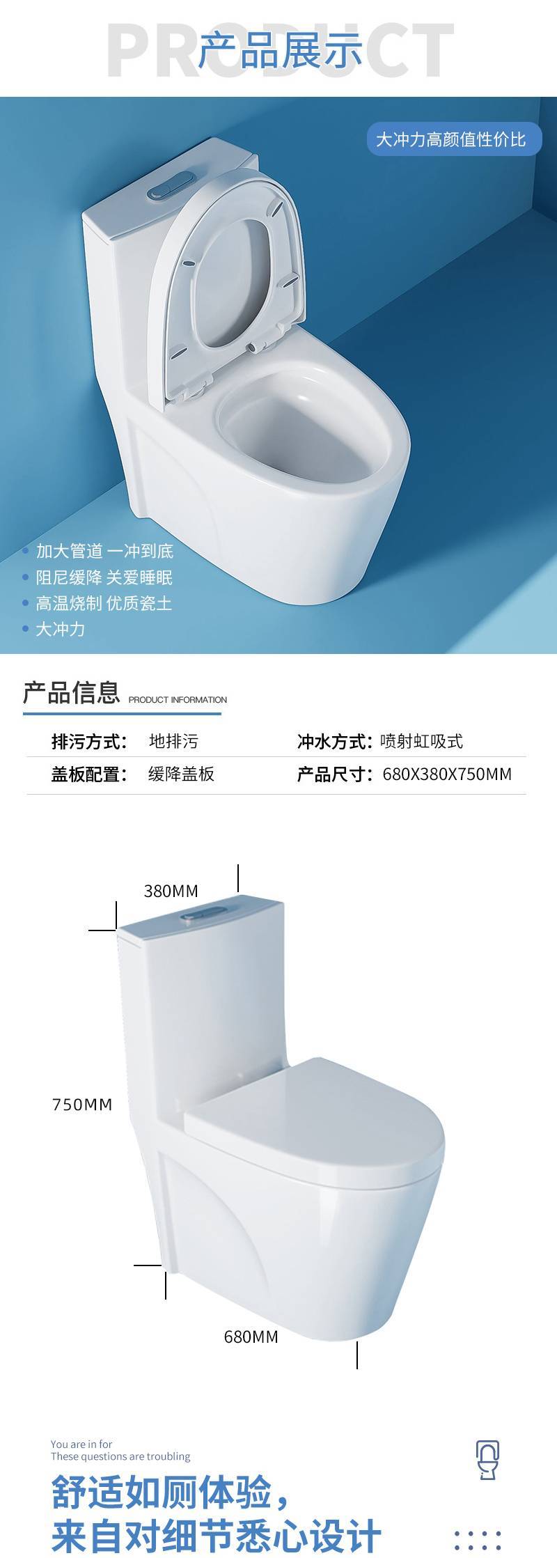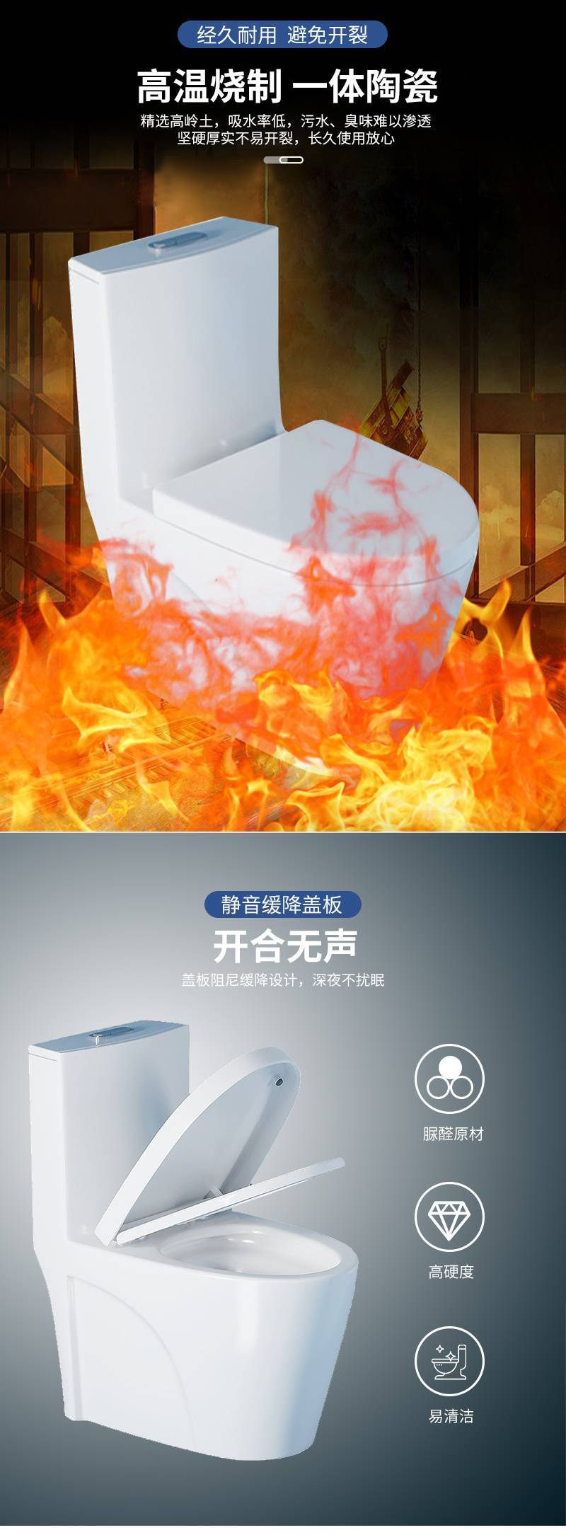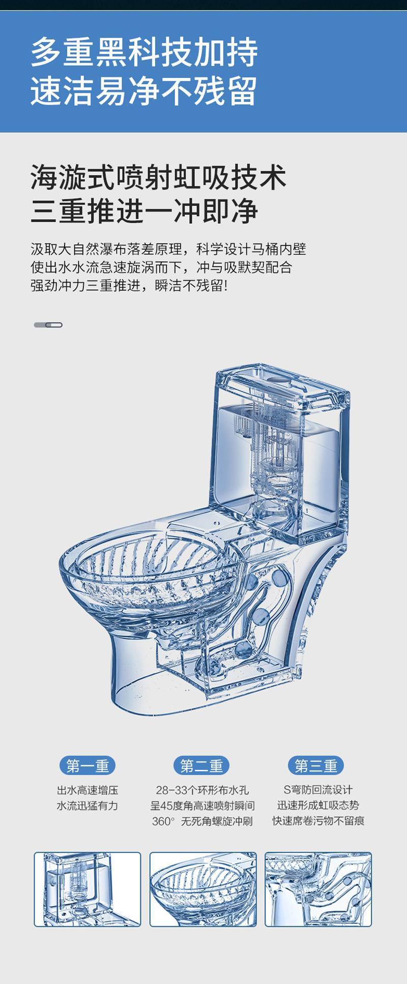 ·强劲冲水,节水设计,自洁釉面,缓降盖板,海漩式喷射虹吸技术,加大管道排污