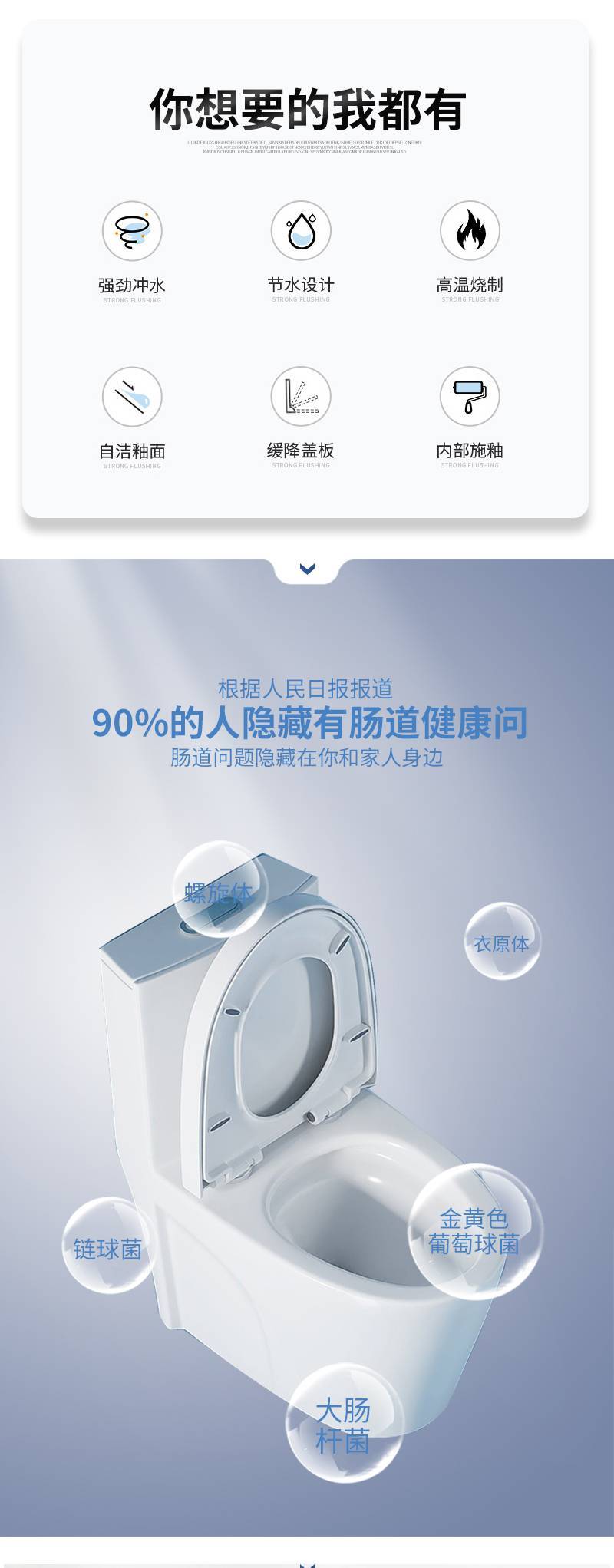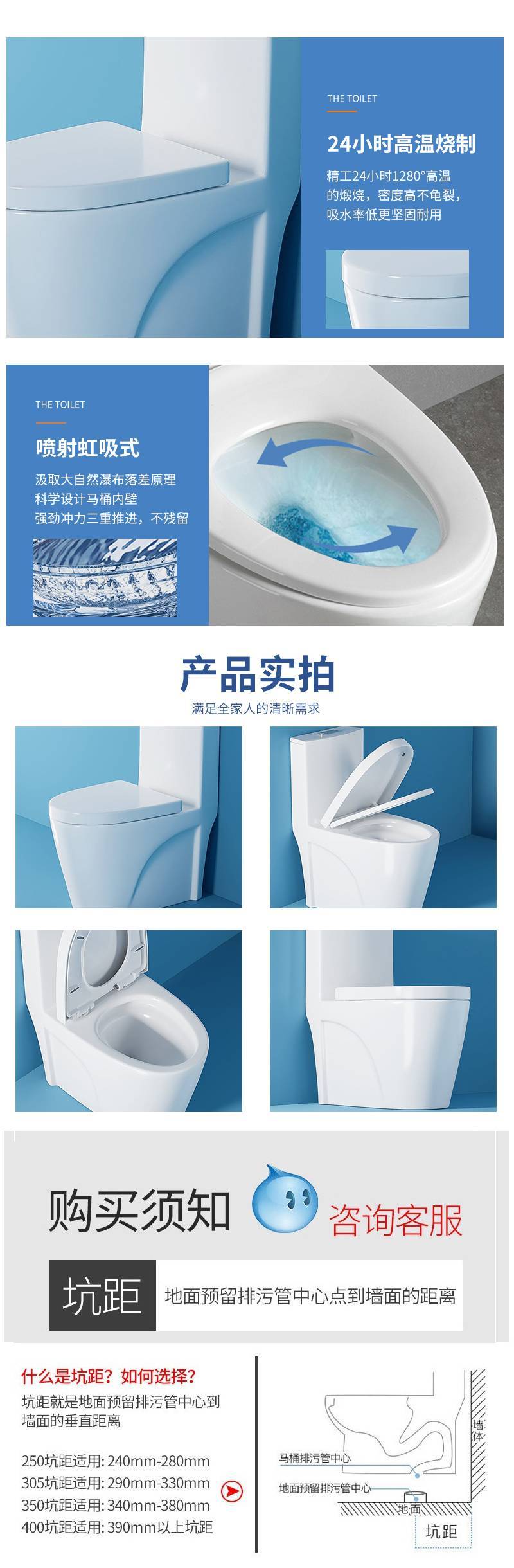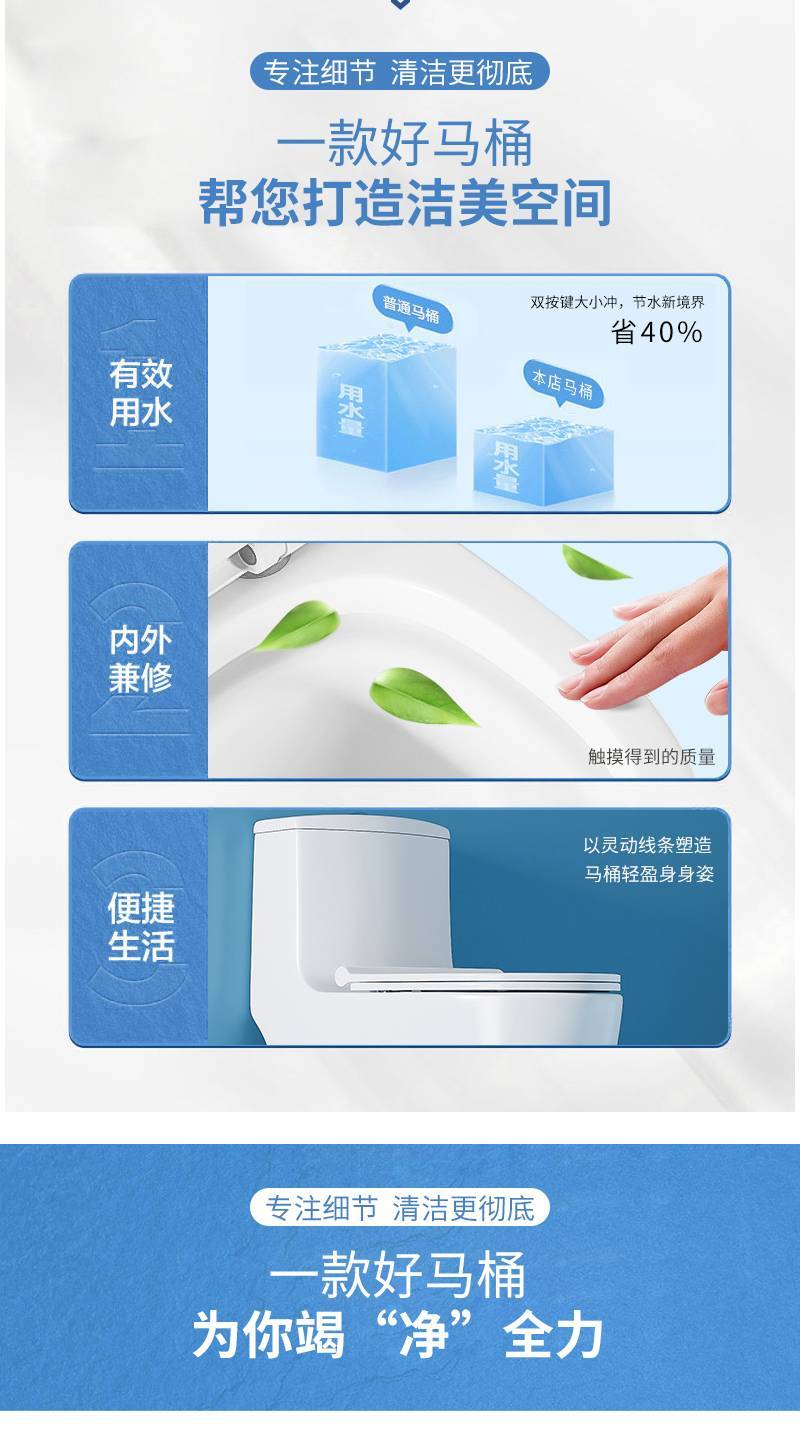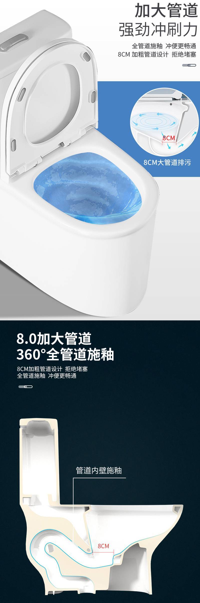 ·强劲冲水,节水设计,自洁釉面,缓降盖板,海漩式喷射虹吸技术,加大管道排污