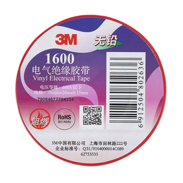 PVC18mm红色20m1600 红色XF0038959353MPVC电气绝缘胶带-普通型1600#系列200卷/箱18mm×20m×0.15mm