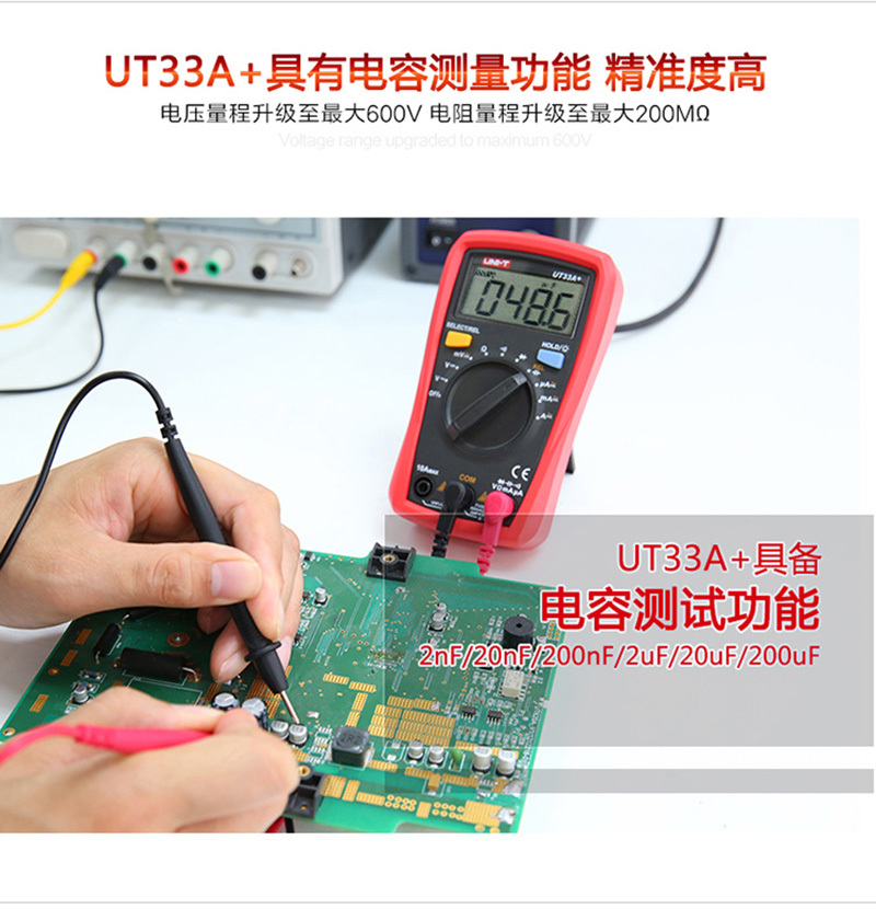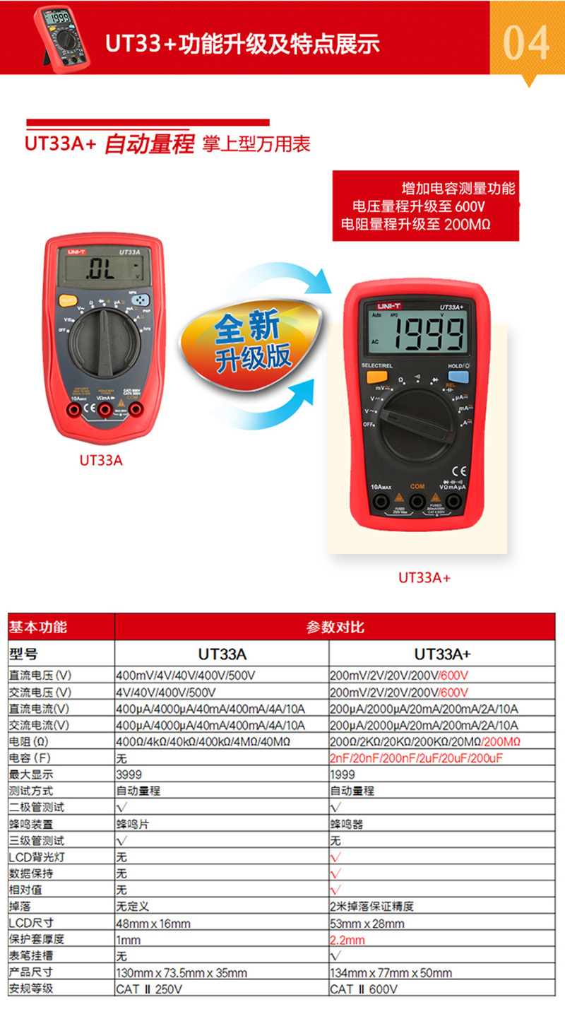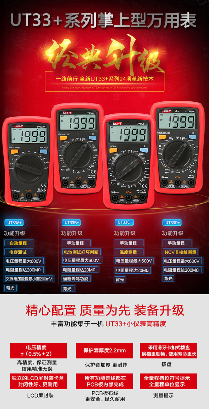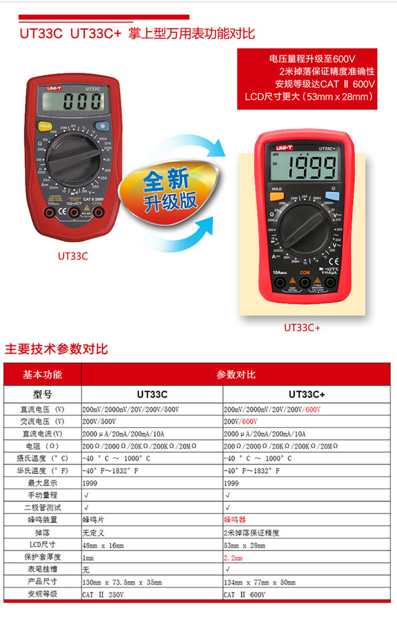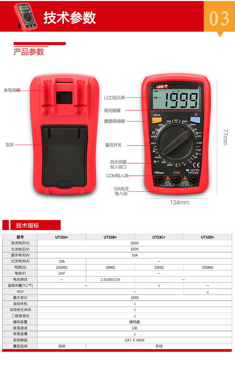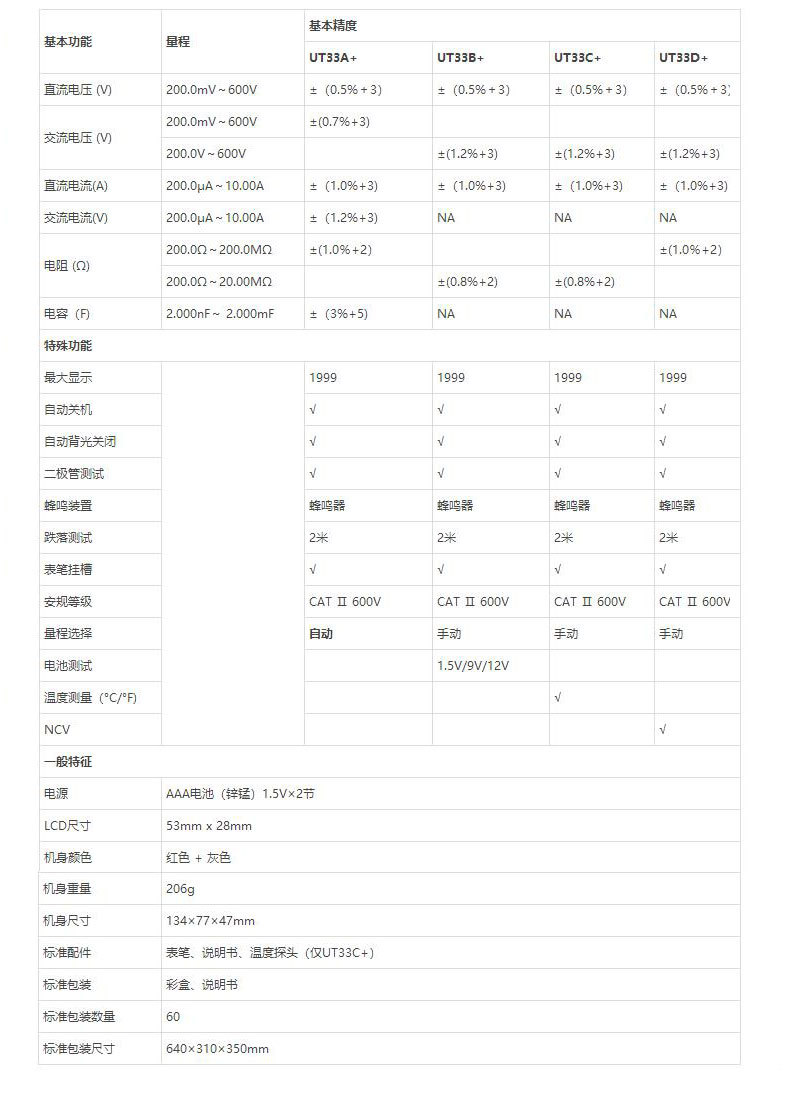 ±(0.5%+3)暂无200Ω/2000Ω/20kΩ/200kΩ/20MΩ200mV~600V200~600V±(1%+3)暂无±(0.8%+2)±(1.2%+3)200μA/20mA/200mA/10AUNI-T/优利德UT33C+掌上型数字万用表 (第二代)--