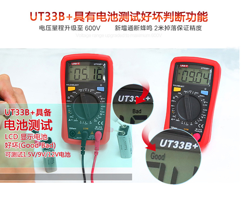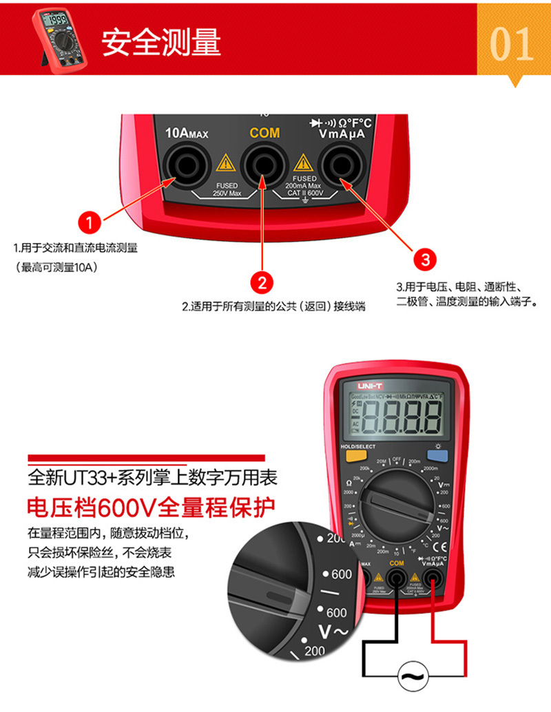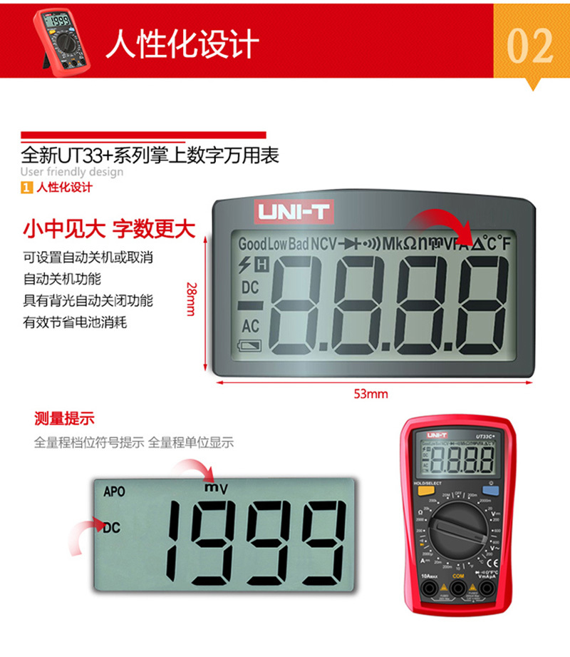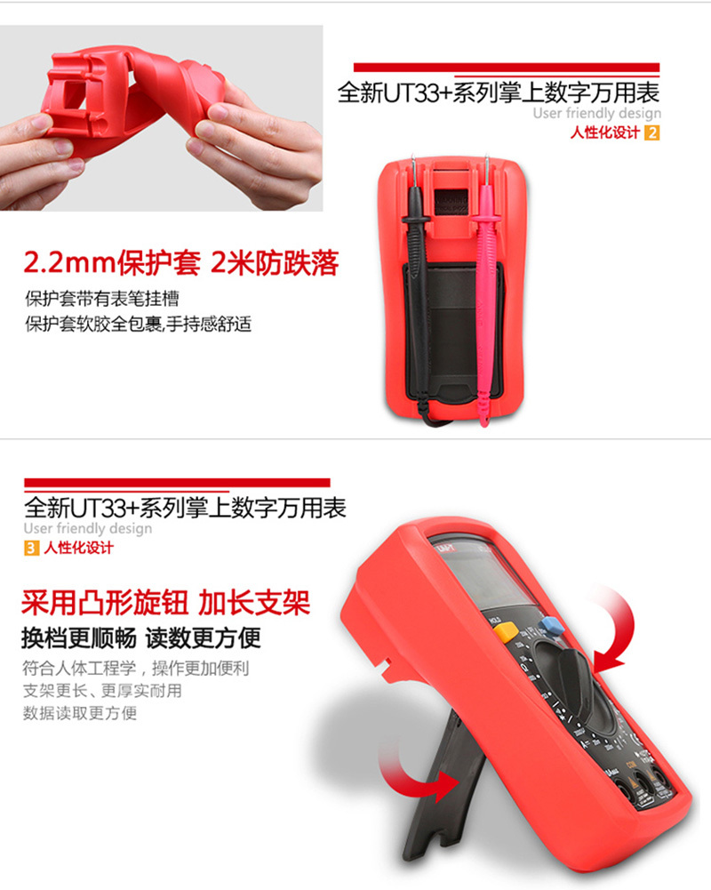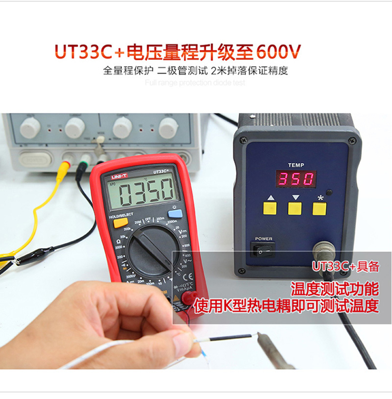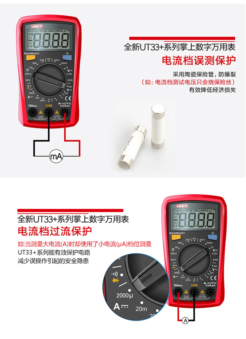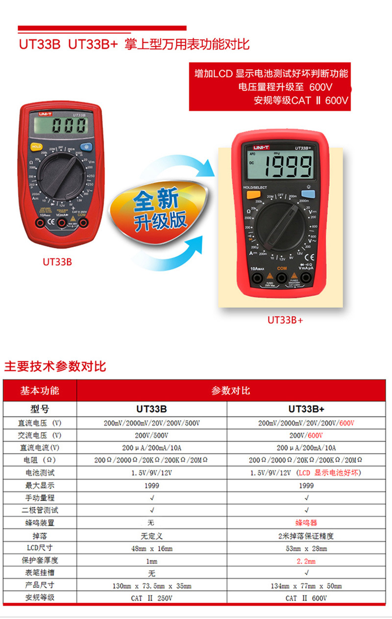±(0.5%+3)暂无200Ω/2000Ω/20kΩ/200kΩ/20MΩ200mV~600V200~600V±(1%+3)暂无±(0.8%+2)±(1.2%+3)200μA/20mA/200mA/10AUNI-T/优利德UT33C+掌上型数字万用表 (第二代)--