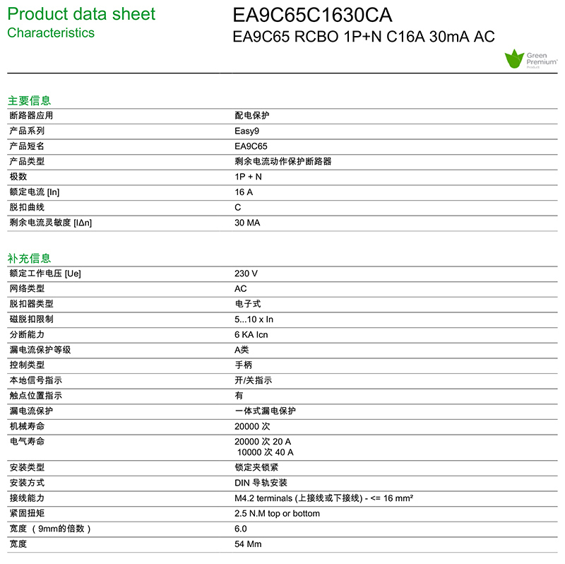 - 制造商型号:EA9C65 1P+N C16A/30mA/A类