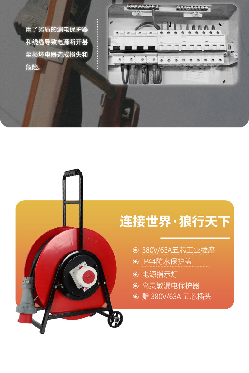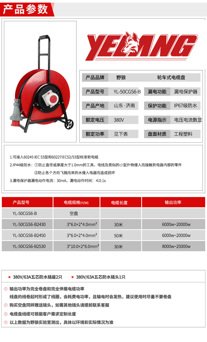 AC380V(3×6+2)mm²×50m台YELANG/野狼L500系列轮车电缆盘(380V工业)YL-50CGS6-B2450-3×6+2×50m