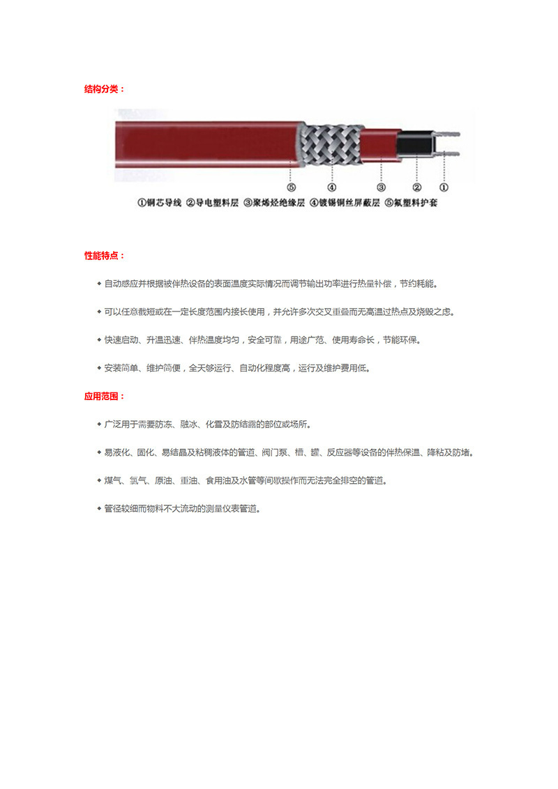 ·自动感应并根据被伴热设备的表面温度实际情况而调节输出功率进行热量补偿,节约耗能 ·可以任意截短或在一定长度范围内接长使用,并允许多次交叉重叠而无高温过热点及烧毁之虑 ·快速启动、升温迅速、伴热温度均匀,安全可靠,用途广范、使用寿命长,节能环保 ·安装简单、维护简便,全天够运行、自动化程度高,运行及维护费用低