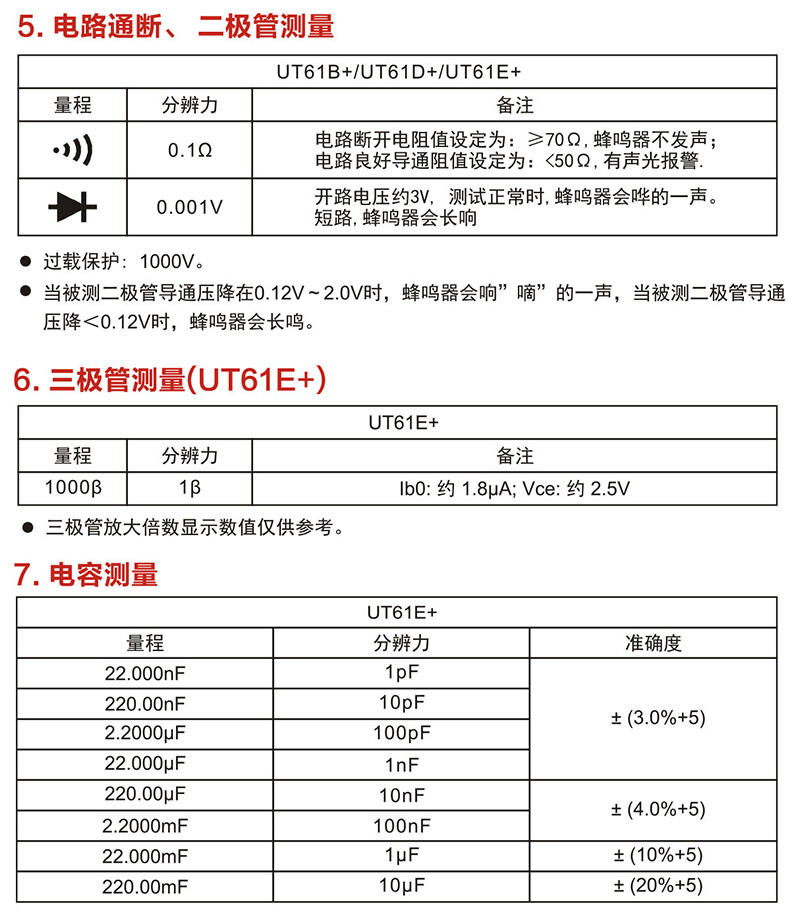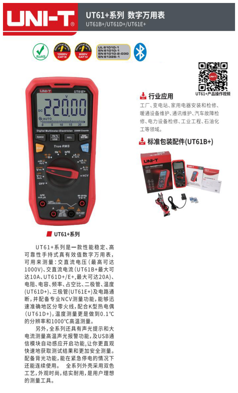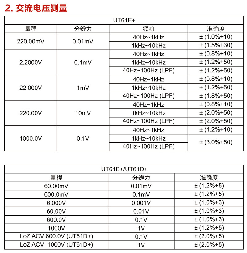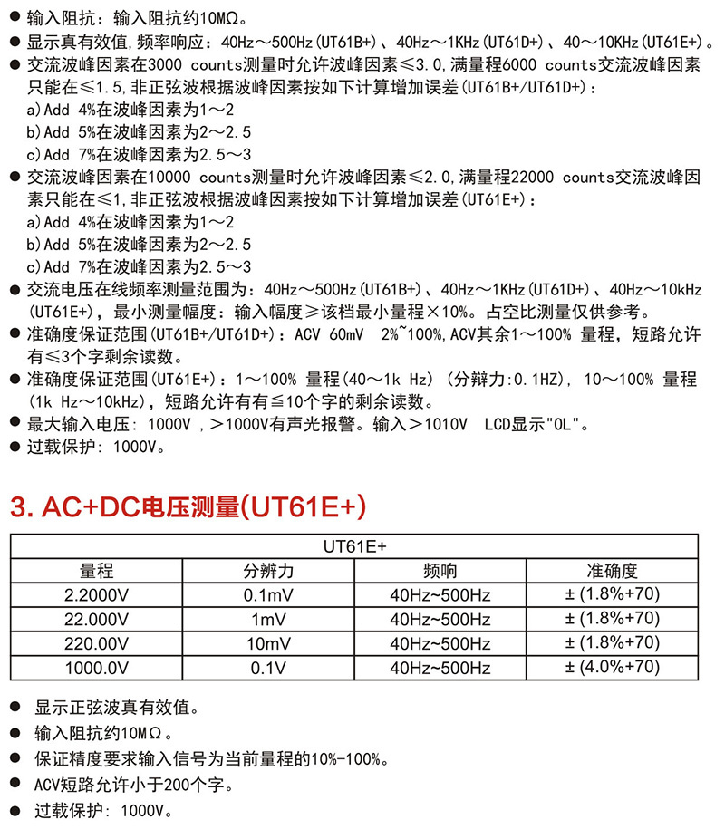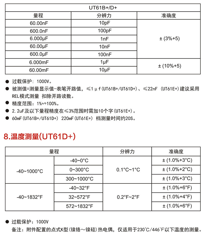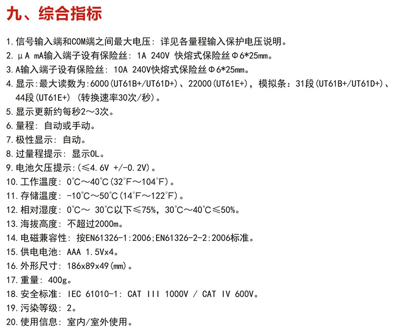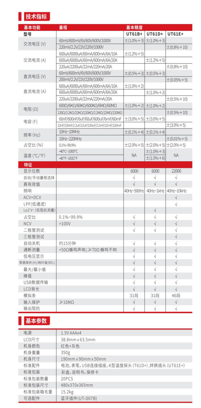 ±(0.5%+3)600μA/6000μA/60mA/600mA/6A/20A600Ω/6kΩ/60kΩ/600kΩ/6MΩ/60MΩ60mV~1000V60mV~1000V±(1.0%+2)±(1.2%+5)±(1.0%+2)±(1.0%+3)600μA/6000μA/60mA/600mA/6A/20AUNI-T/优利德UT61E+智能型数字万用表--