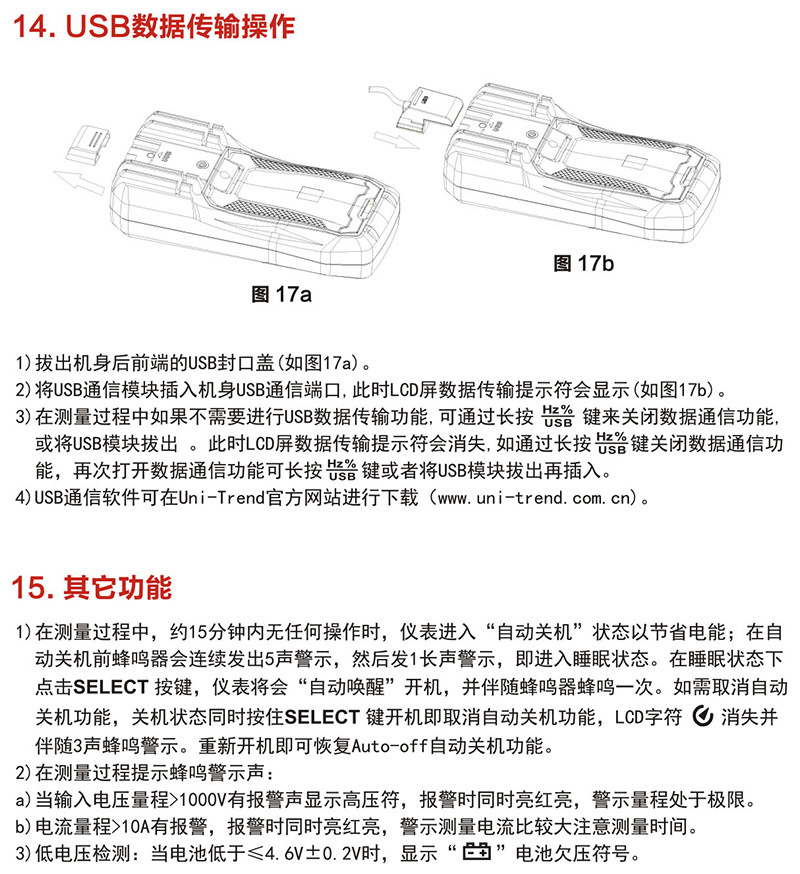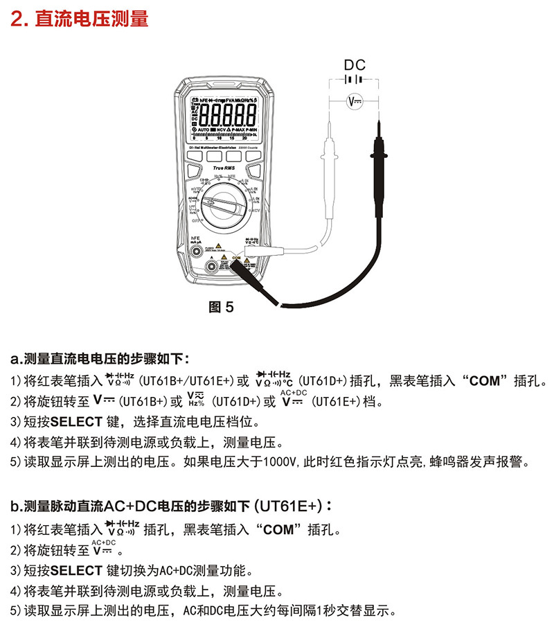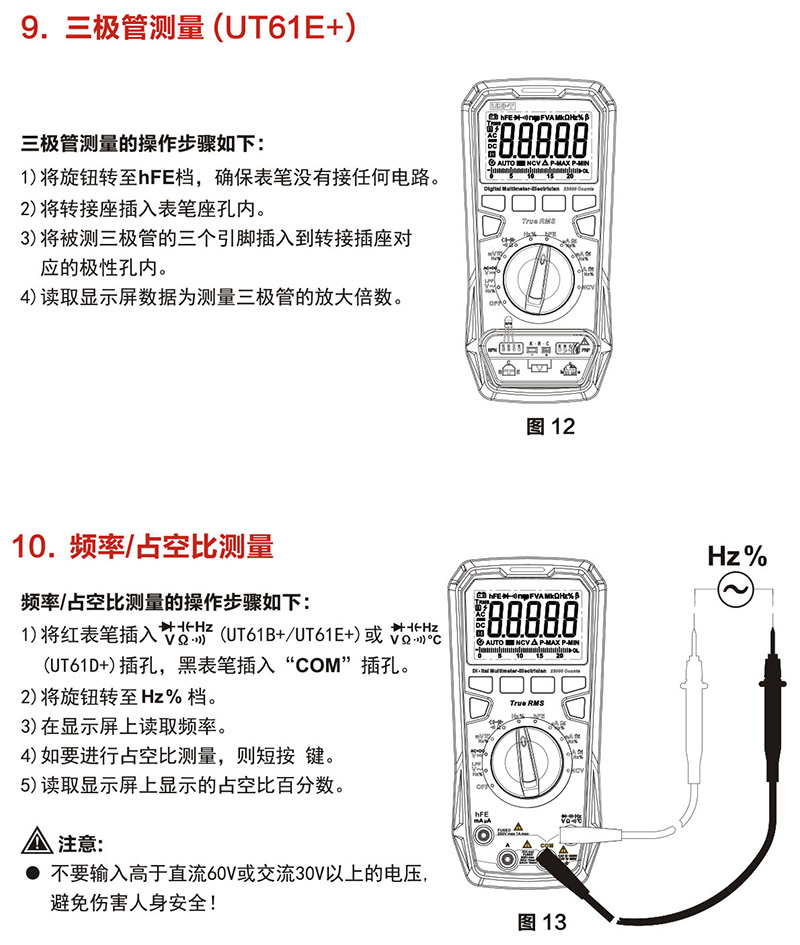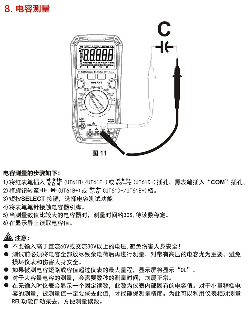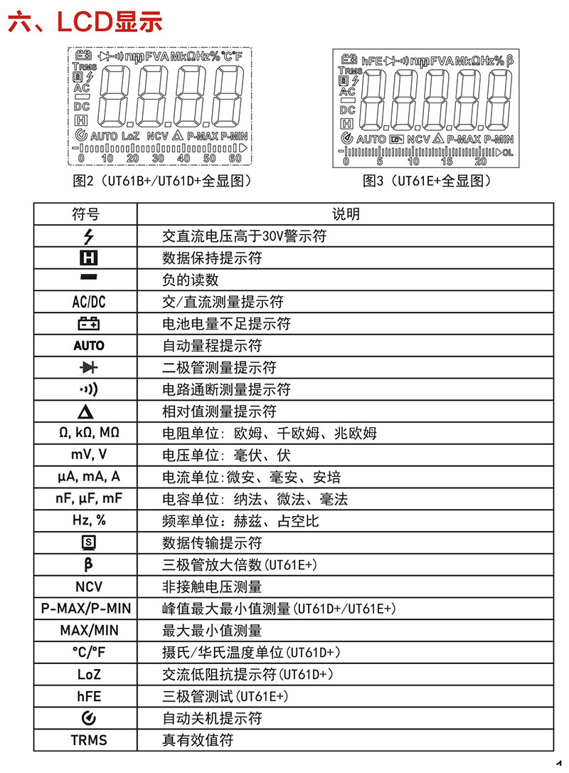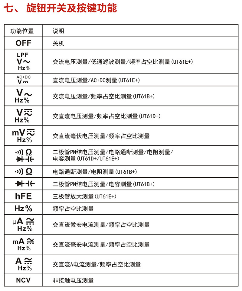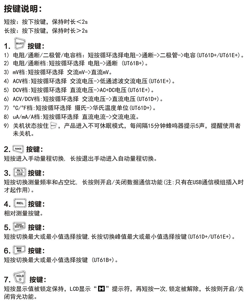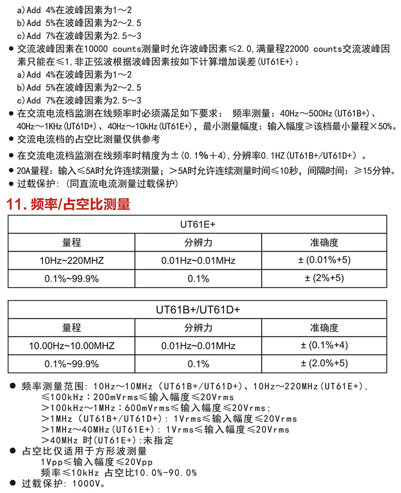 ±(0.5%+3)600μA/6000μA/60mA/600mA/6A/20A600Ω/6kΩ/60kΩ/600kΩ/6MΩ/60MΩ60mV~1000V60mV~1000V±(1.0%+2)±(1.2%+5)±(1.0%+2)±(1.0%+3)600μA/6000μA/60mA/600mA/6A/20AUNI-T/优利德UT61E+智能型数字万用表--