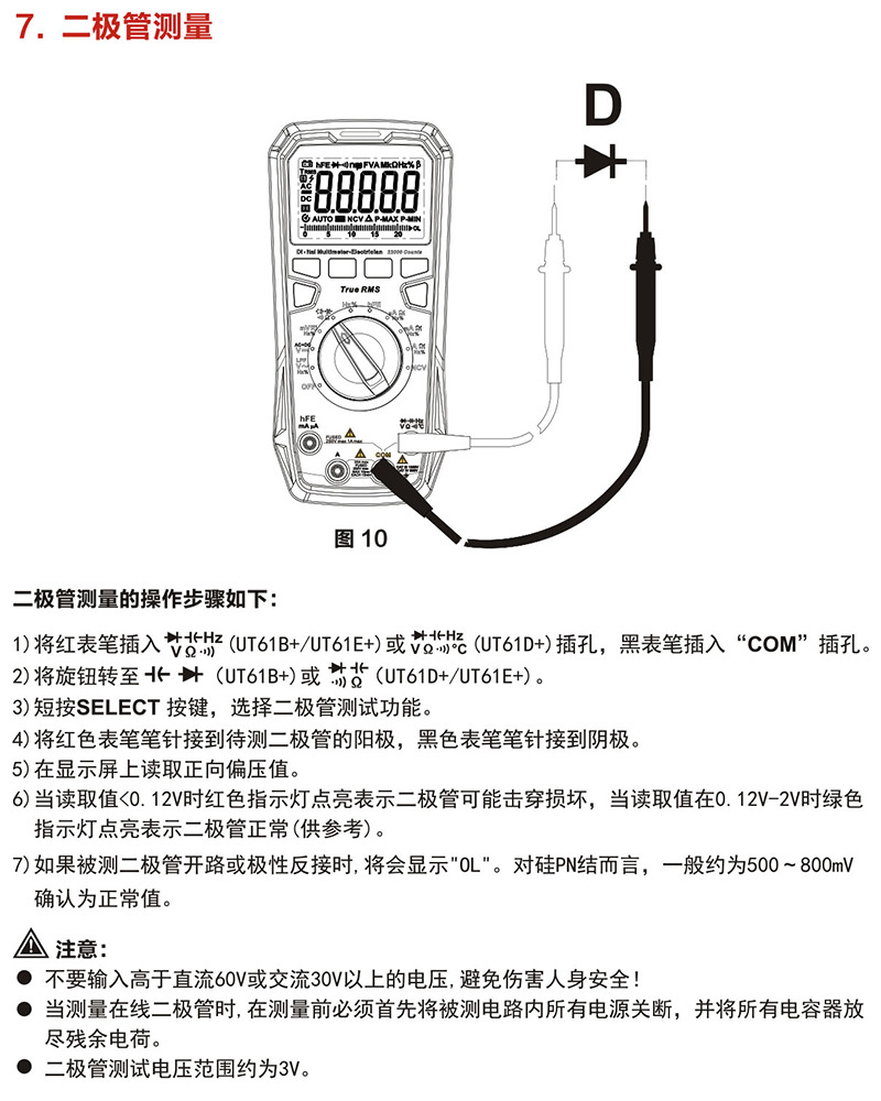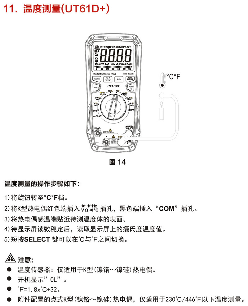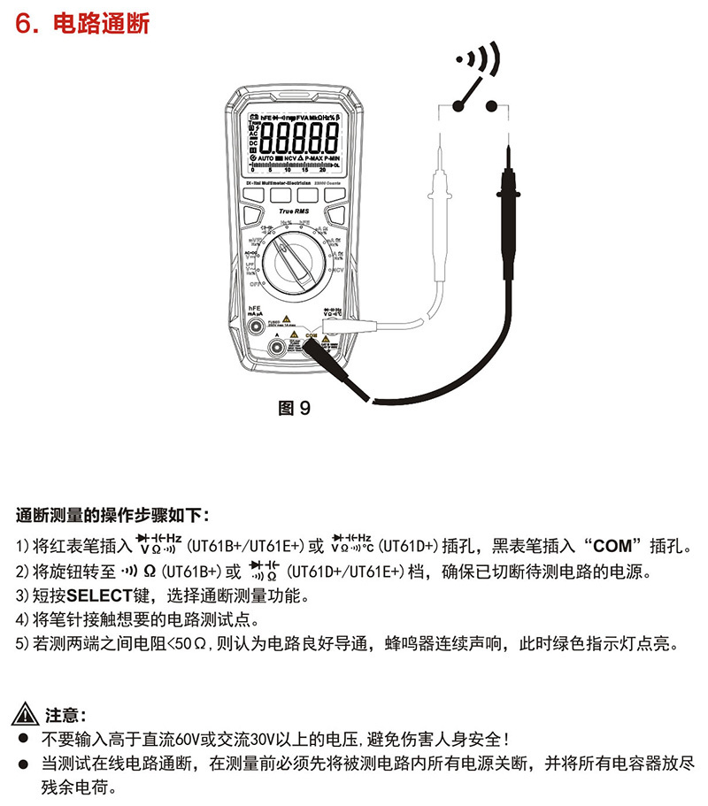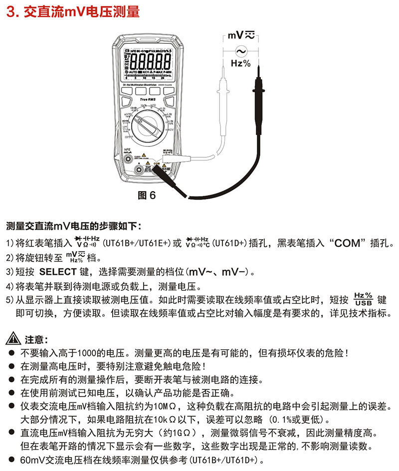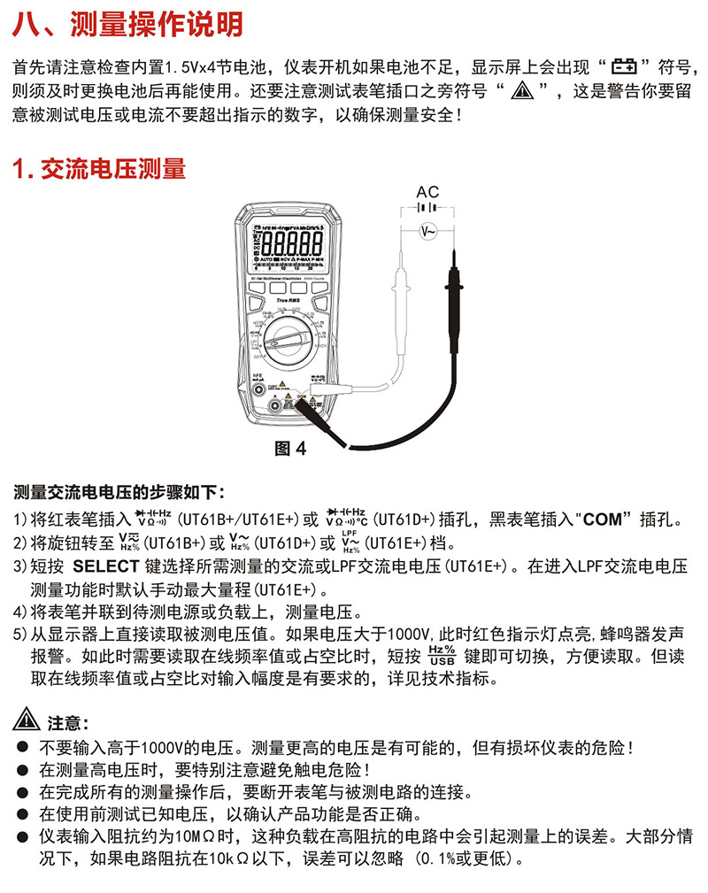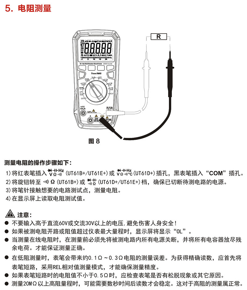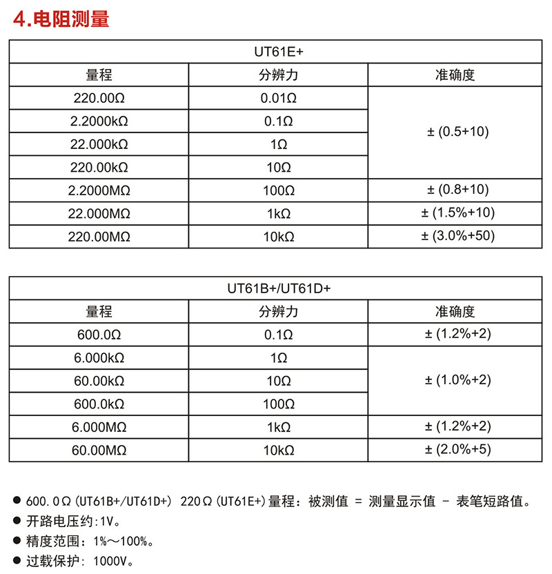 - 电阻量程:600Ω/6kΩ/60kΩ/600kΩ/6MΩ/60MΩ