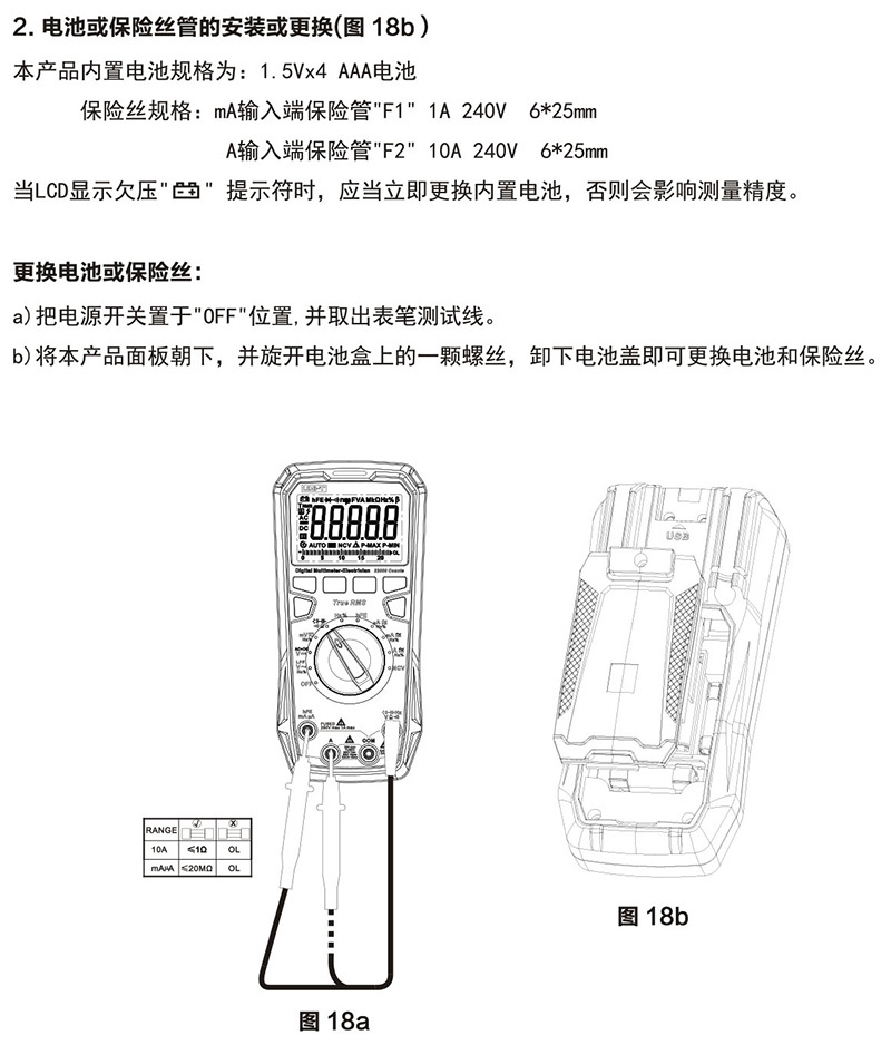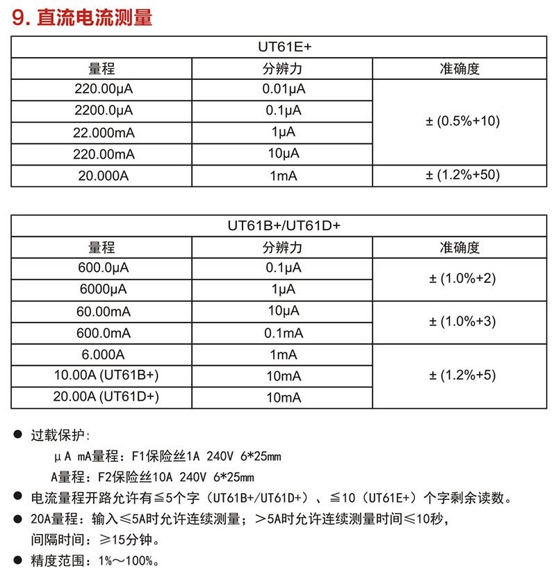 - 直流电流量程:600μA/6000μA/60mA/600mA/6A/20A