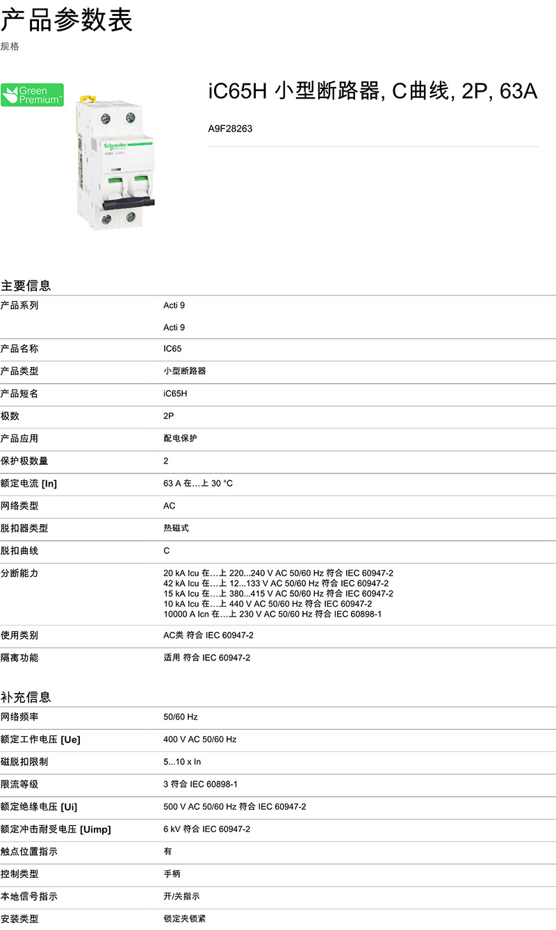 10kA63A2PAC400VCIC65H2PC63A6个/包 9包/箱A9F28263SCHNEIDER/施耐德电气IC65H系列小型断路器IC65H系列6个/包 9包/箱-