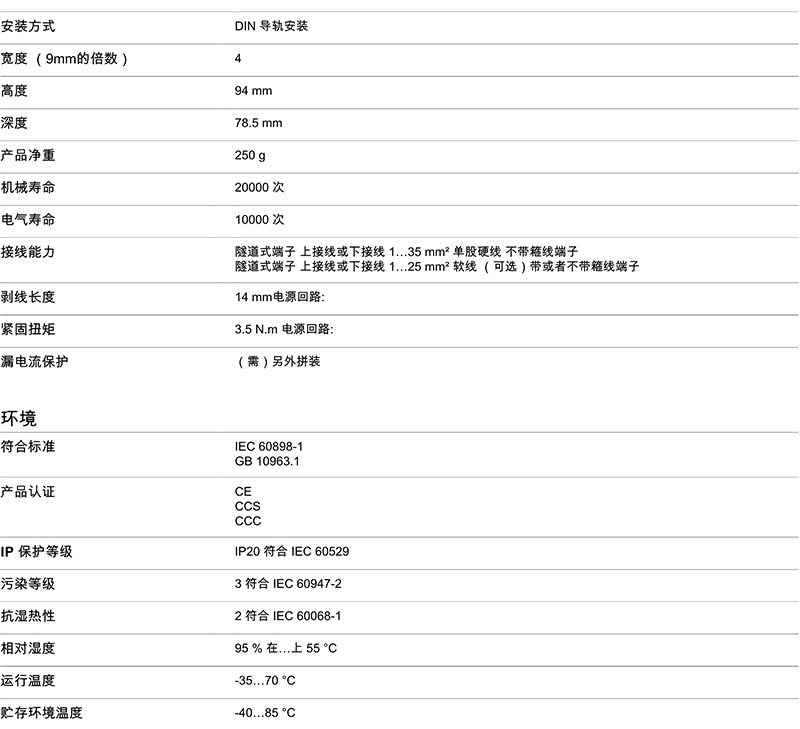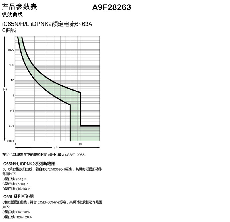 · 具有短路保护、过载保护、控制、隔离功能;冲击耐电压为6kV,限流等级为3级,机械寿命达20000次;隧道式接线端子,1A到32A适用于25平方毫米及以下导线,40A到63A适用于35平方毫米及以下导线;模块化结构,可方便地安装在DIN标准导轨上;符合IEC60898/GB10963-2004,获得CCC认证证书。 ·适用于工业、民用建筑、能源及基础设施等领域的低压终端配电。 ·C65N系列分断能力为6kA。 ·C65H系列分断能力为10kA,用于直流系统保护。 ·NC100H/NC125H系列分断能力。 ·1P:130V电压下为20kA,230~400V电压下为10kA。 ·2/3/4P:230V电压下为20kA,400V电压下为10kA,440V电压下为6kA。 ·NG125H系列分断能力:36kA。