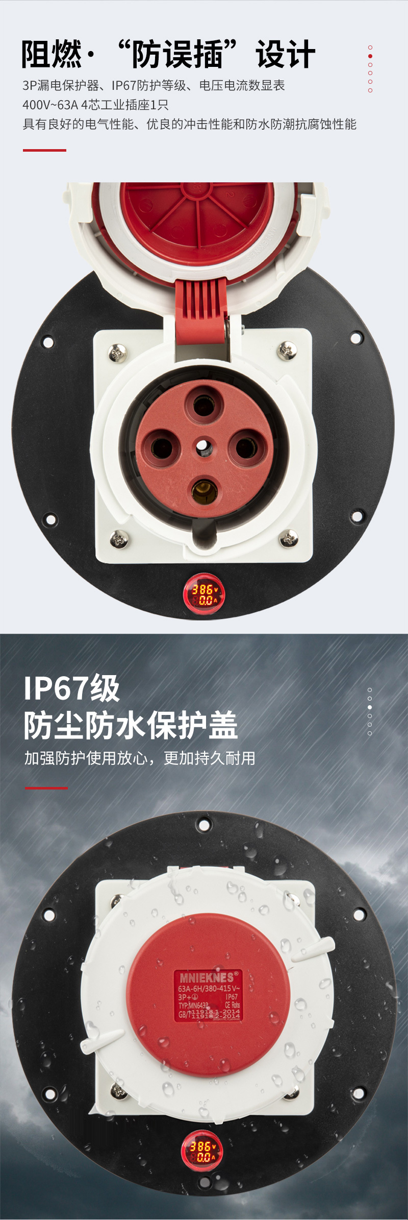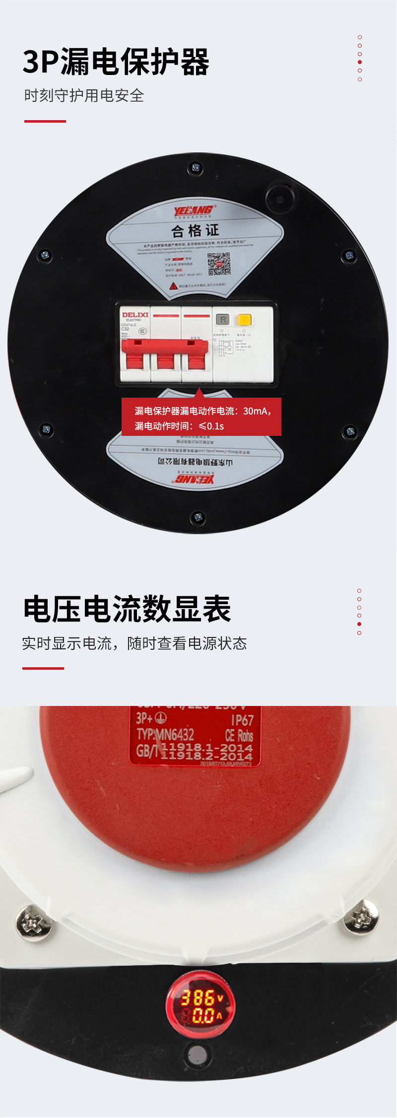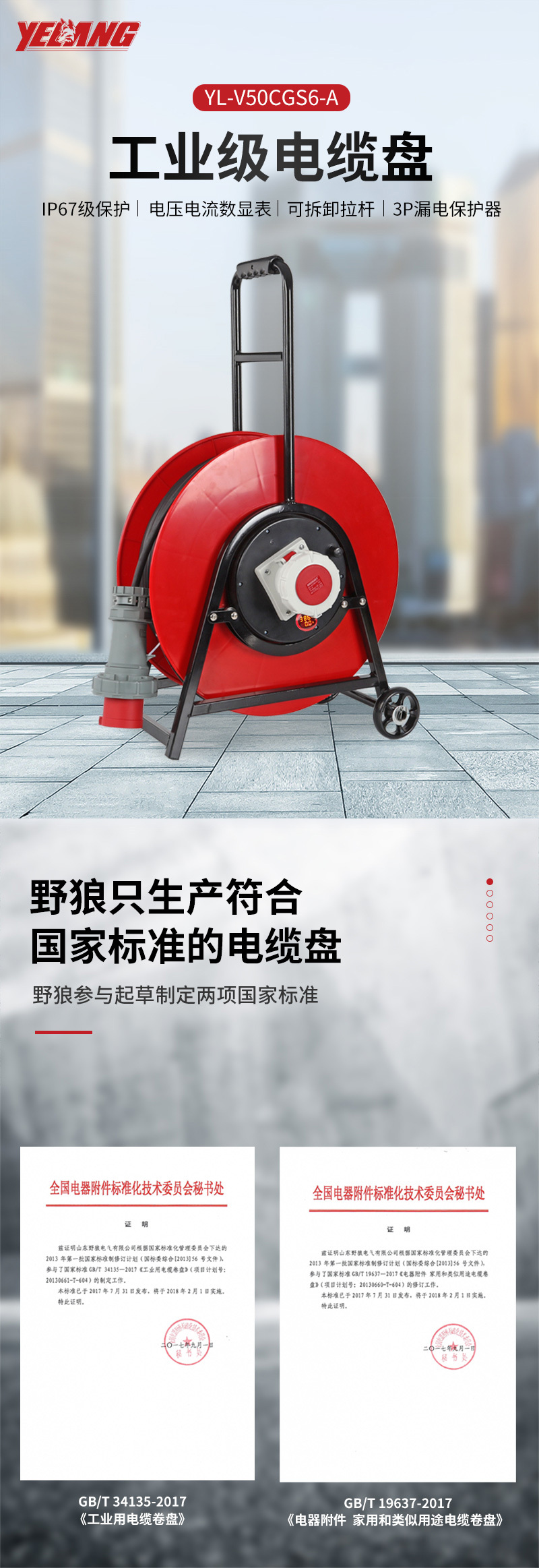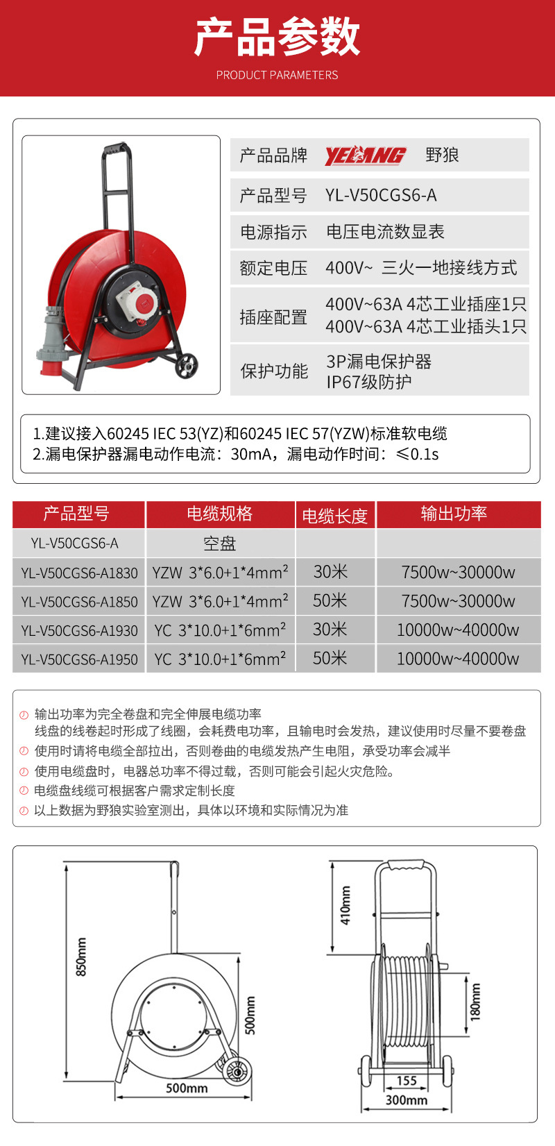 ·有数显功能 (电流电压) ·新国标防护门防尘保护插座 ·野狼防雨防雷线盘适合抗洪抢险和雨天或室外使用 ·插座铜件采用纯铜镀镍插片,耐用且导电性能强 ·野狼工业级通电显示灯插头+线盘插座部分有通电显示灯,有电没电一眼明了,更能保证使用者安全 ·过热保护器可承载56度高温下使用,超载会自行切断线盘通电且重启需要人工操作恢复大大增加使用安全 ·便携式或轮式人性化设置给使用者大大增加线盘的使用便捷 ·国标插座工业插座、电缆线规格及长度等特殊功能及种类繁多,满足大多客户使用需求 ·电缆线野狼采用品牌如:上线缆等,确保产品质量安全第一等特点