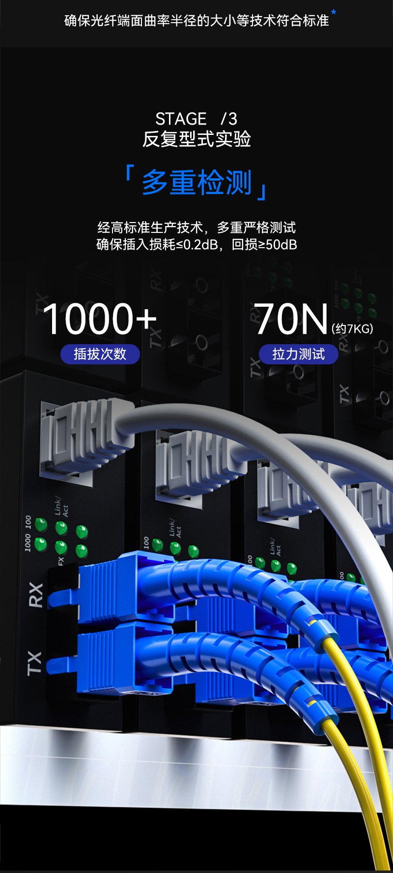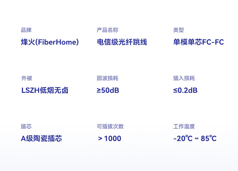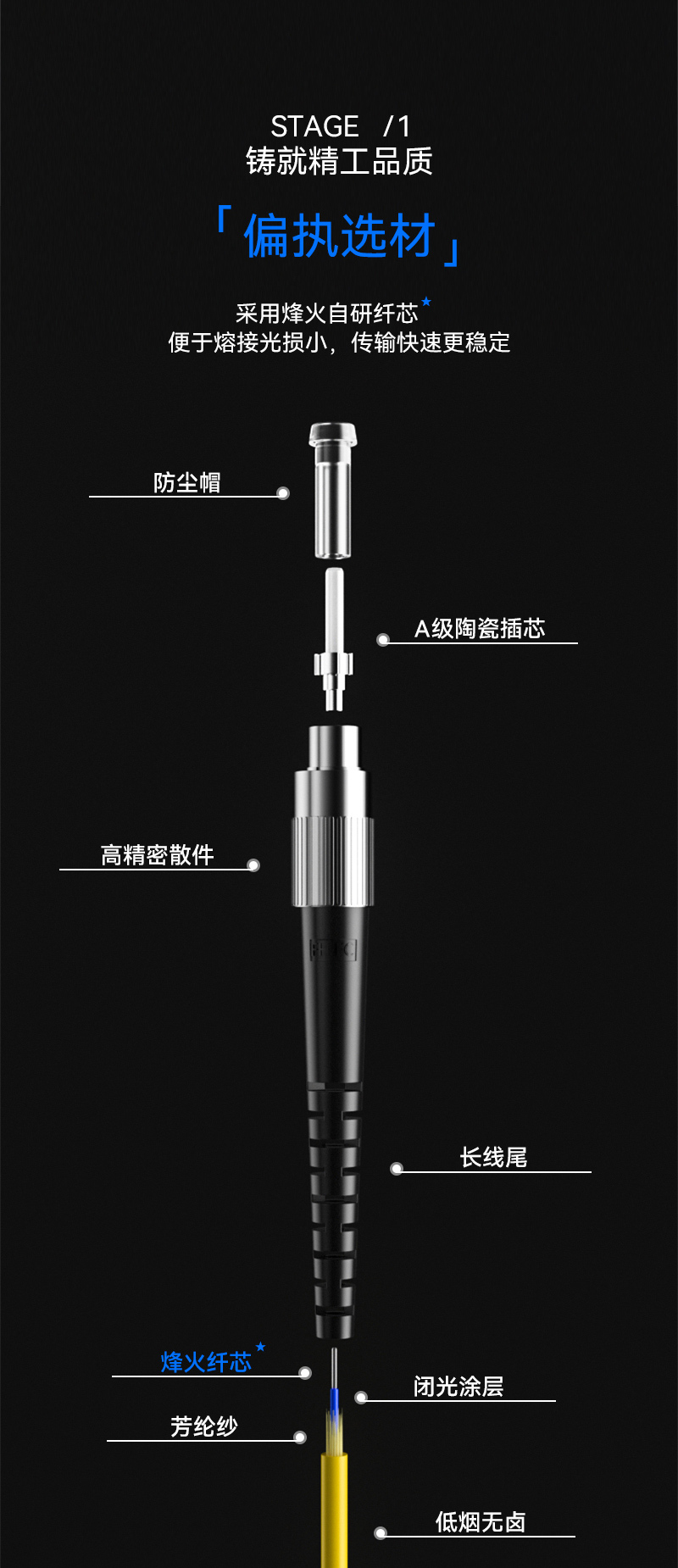 ·PVC保护外套,中层芳纱纶抗拉丝,内层护套闭光涂层,石英玻璃纤芯。三环A级陶瓷插芯,0.3同心度,精度高,互换性强,可重复插拔1000次,传输稳定使用寿命长,带宽升级无瓶颈,技术工艺层层严控,损耗更低。
