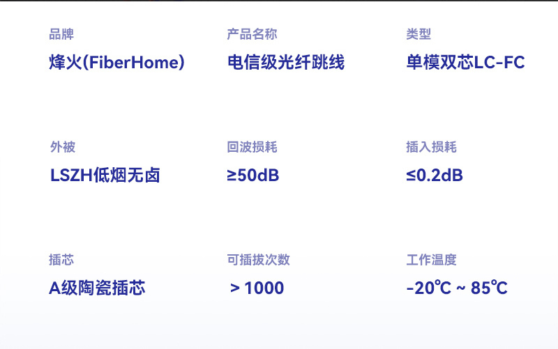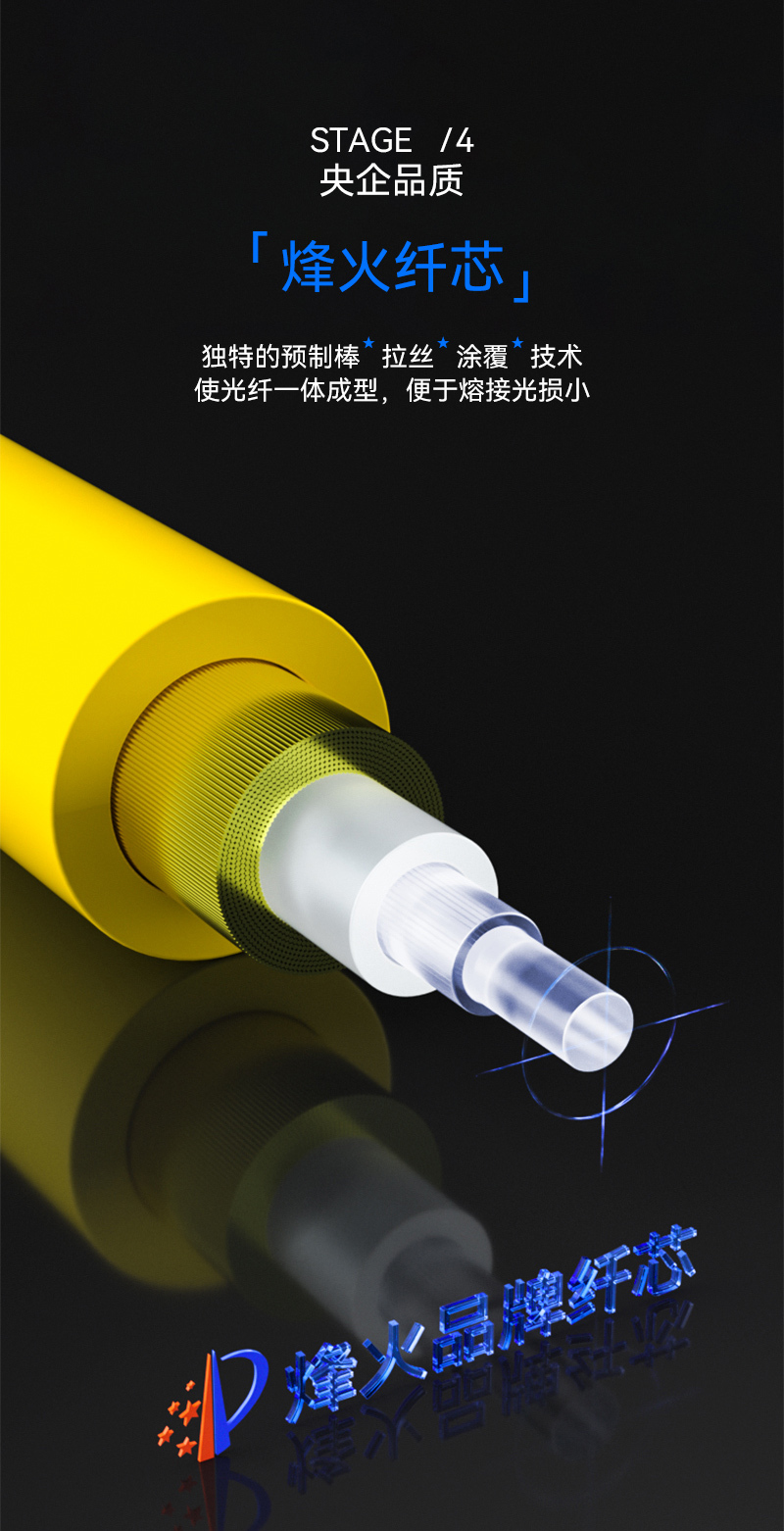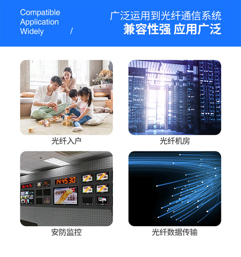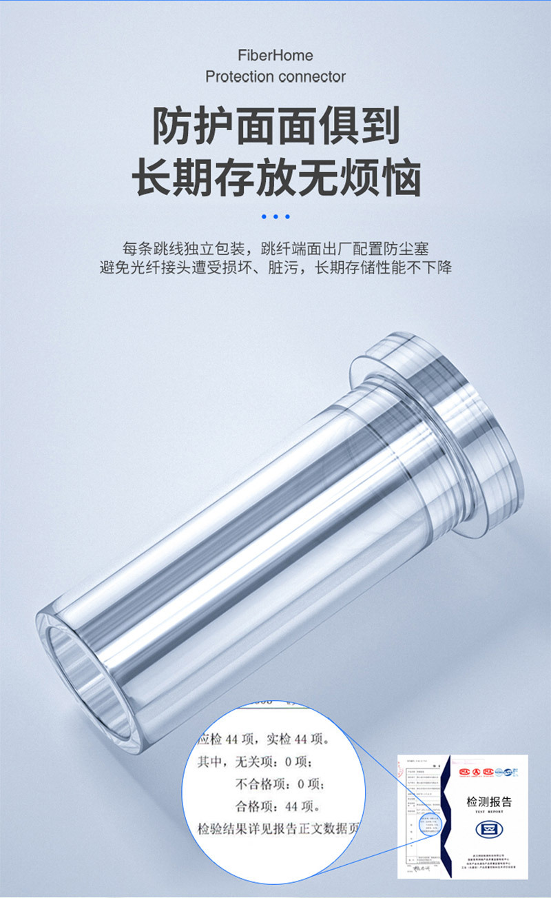 ·PVC保护外套,中层芳纱纶抗拉丝,内层护套闭光涂层,石英玻璃纤芯。三环A级陶瓷插芯,0.3同心度,精度高,互换性强,可重复插拔1000次,传输稳定使用寿命长,带宽升级无瓶颈,技术工艺层层严控,损耗更低。