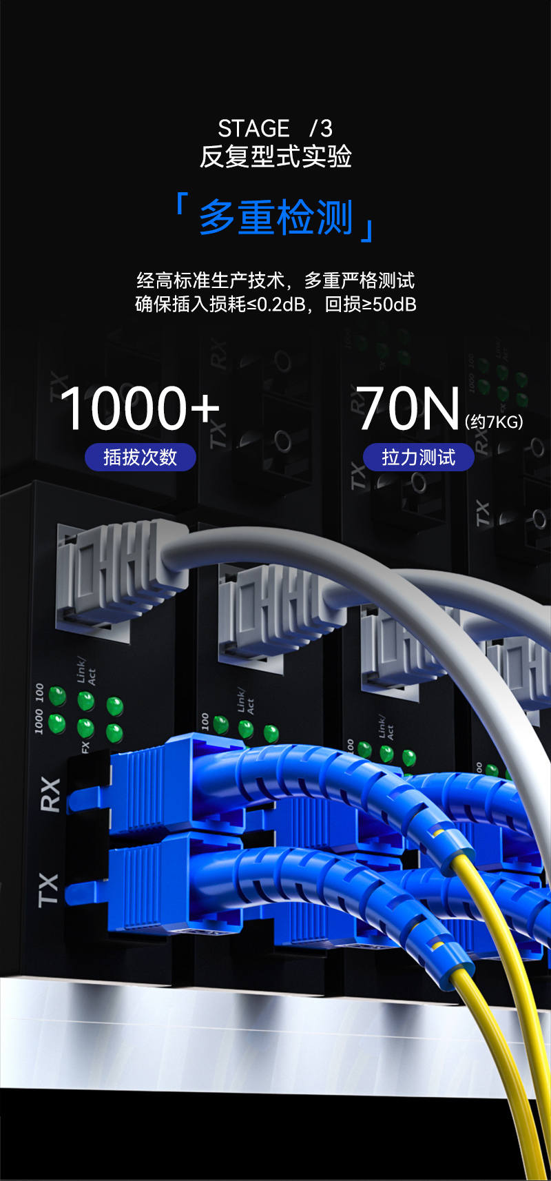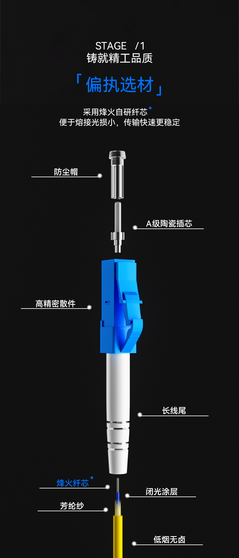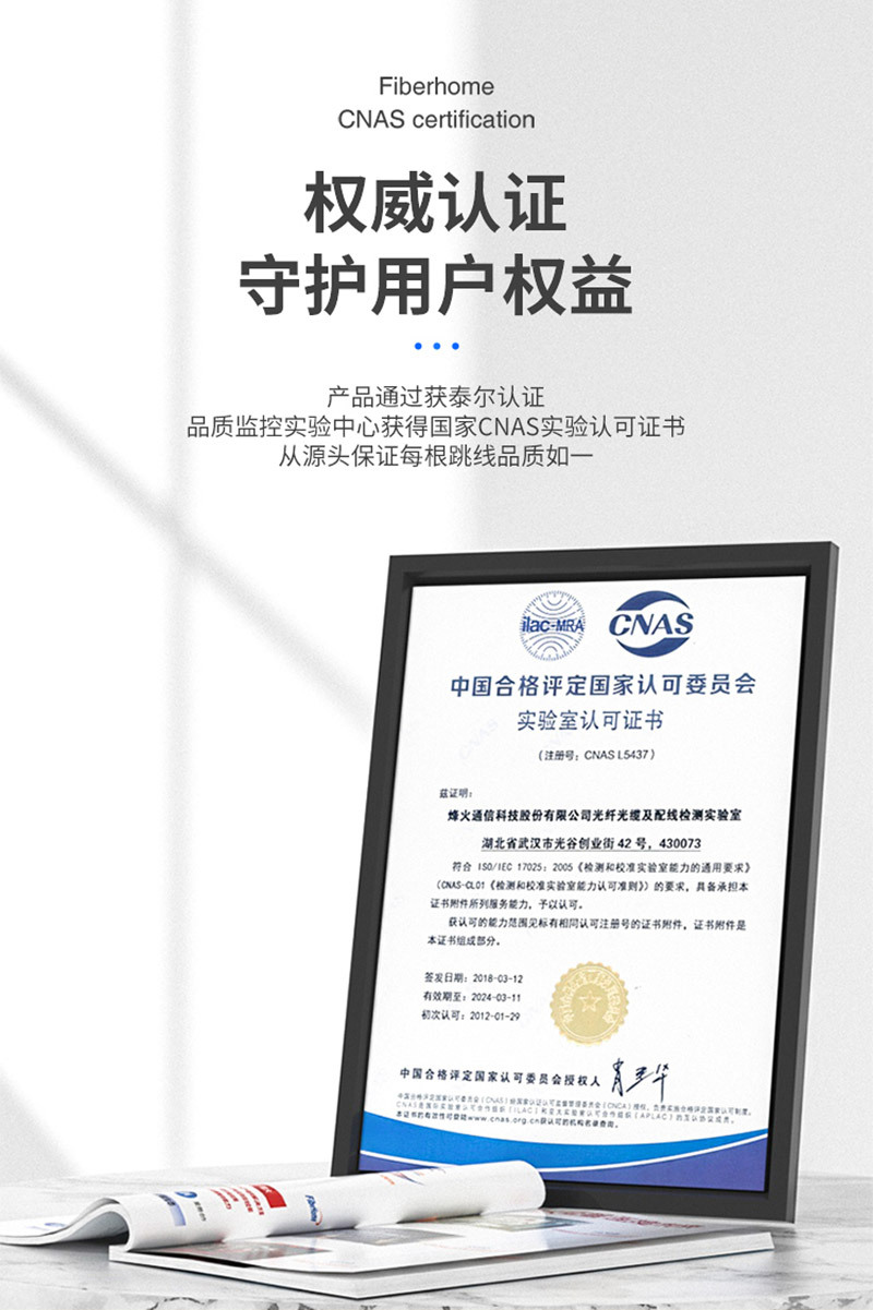 ·PVC保护外套,中层芳纱纶抗拉丝,内层护套闭光涂层,石英玻璃纤芯。三环A级陶瓷插芯,0.3同心度,精度高,互换性强,可重复插拔1000次,传输稳定使用寿命长,带宽升级无瓶颈,技术工艺层层严控,损耗更低。