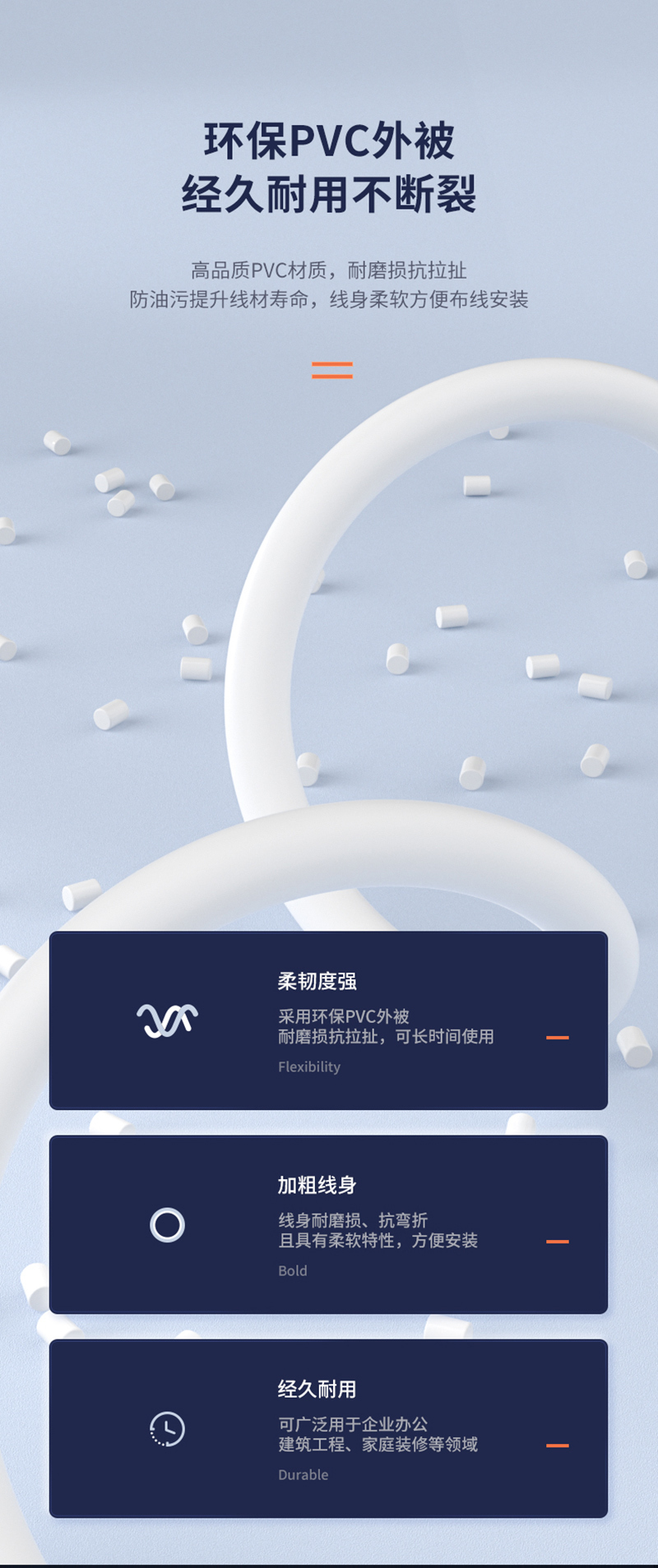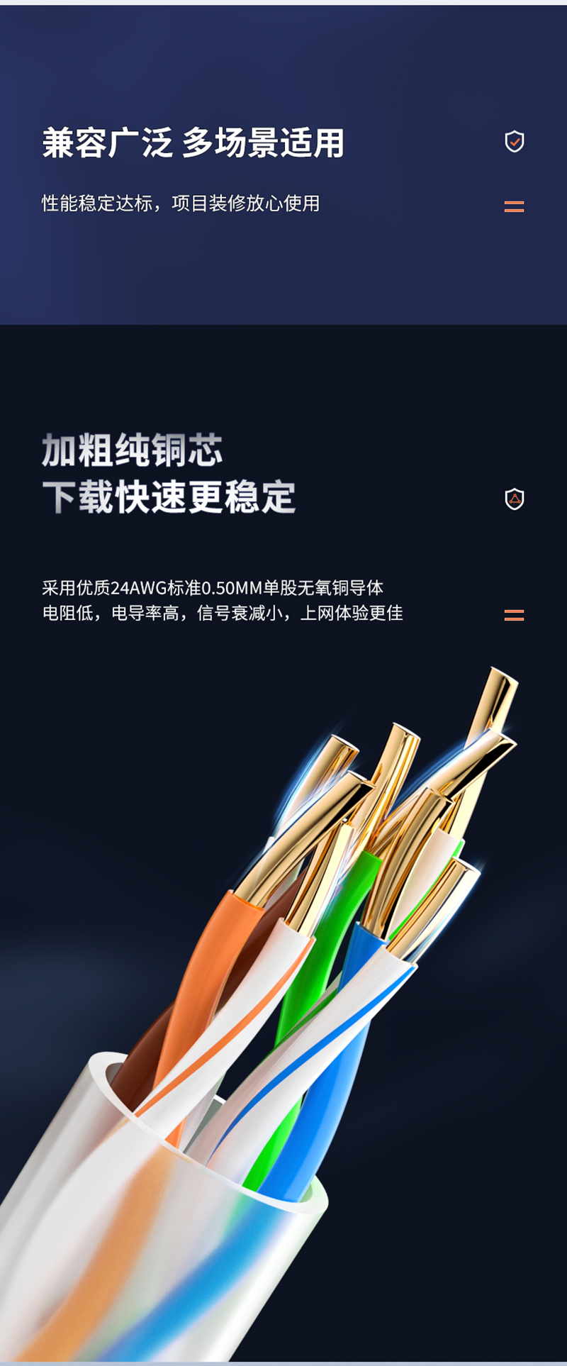 ·RJ45镀金接口,纯铜镀金触点,抗氧化不生锈;符合24AWG标准,线径越粗电阻越小,传输能力越强;加厚PVC外被,环保阻燃抗拉伸