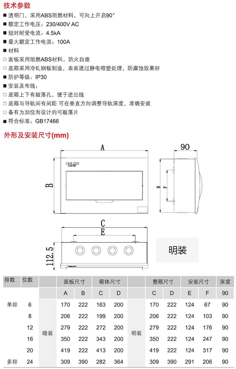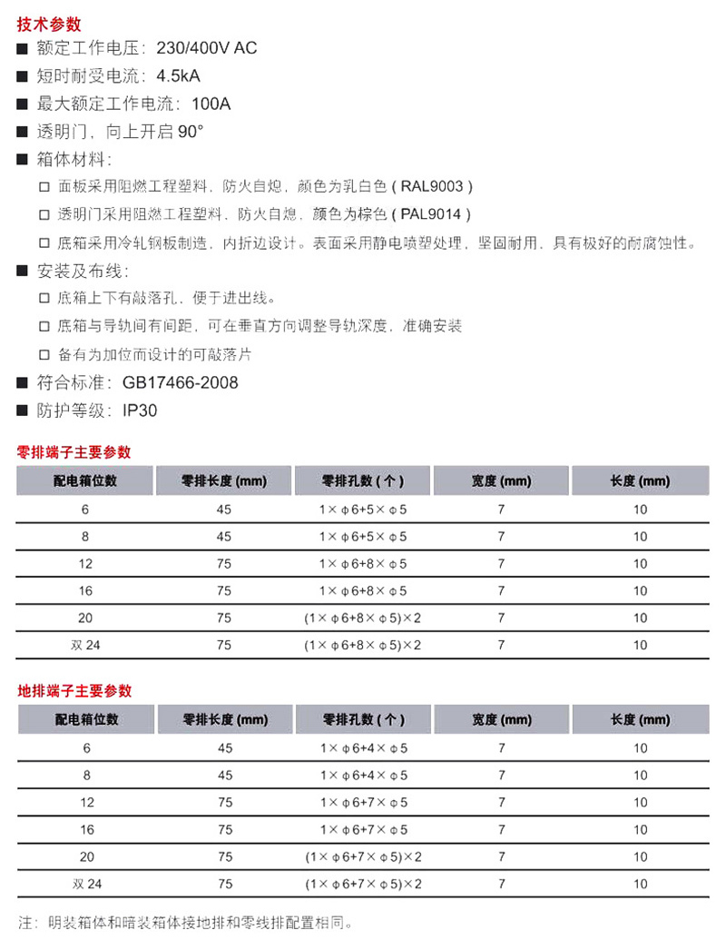 ·透明门,采用ABS阻燃材料,可向上开启90° ·额定工作电压:230/400V AC,短时耐受电流:4.5kA,最大额定工作电流:100A ·面板采用阻燃ABS材料,防火自熄。底箱采用冷轧钢板制造,表面通过静电喷塑处理,防腐蚀效果好。 ·防护等级:IP30 ·符合标准:GB7251 /GB17466