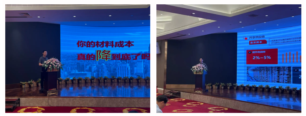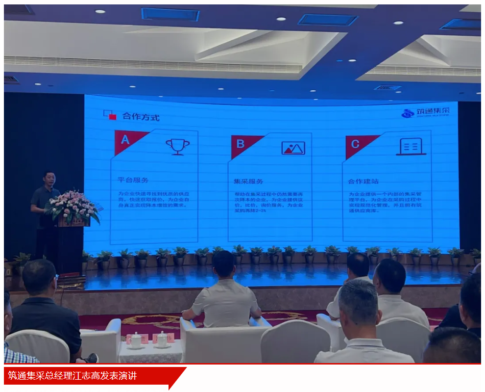 筑通集采总经理江志高代表筑通上台发言,介绍了筑通平台及平台几大核心业务:线上招投标、一键询价、“筑通宝”商机服务、集采商城、找供应商。